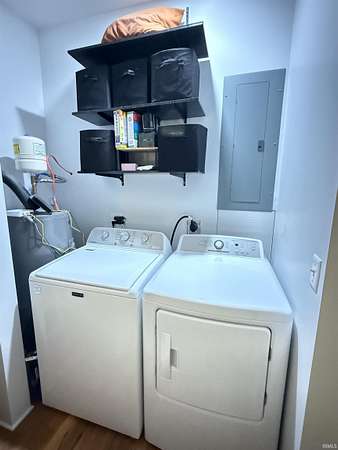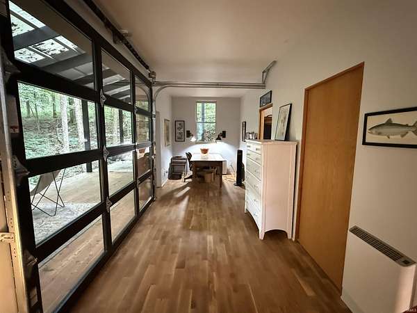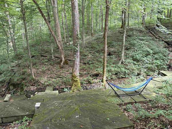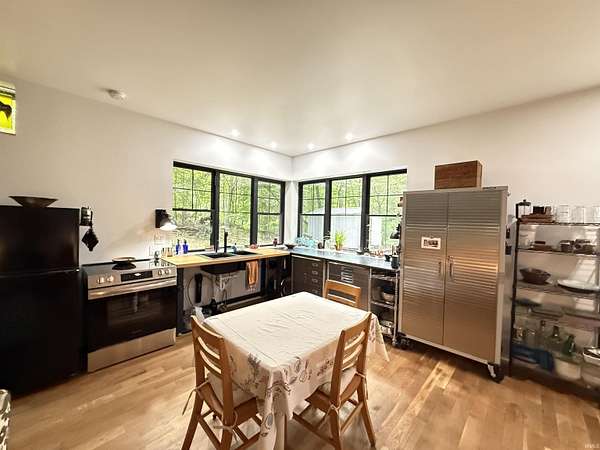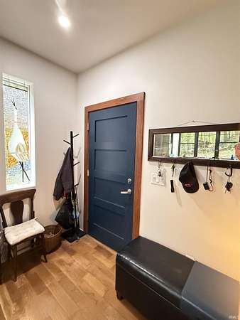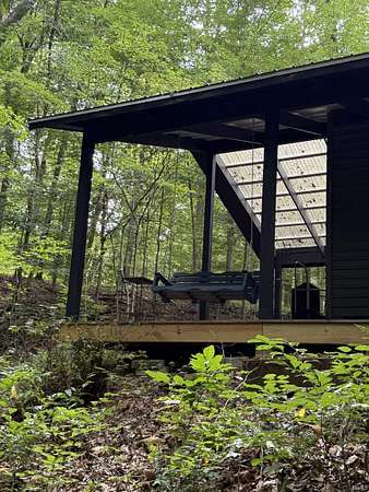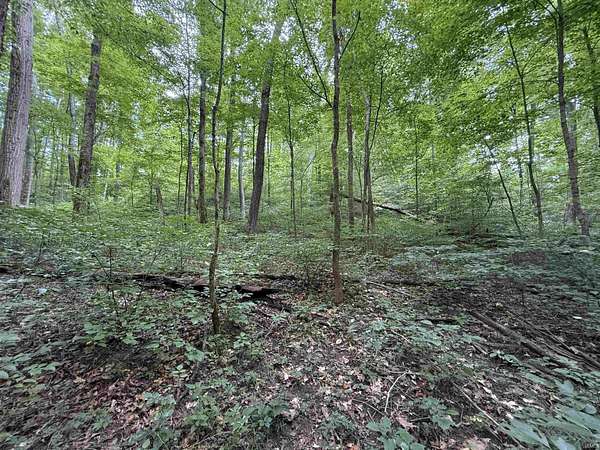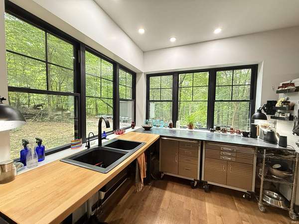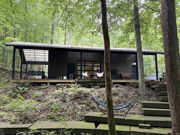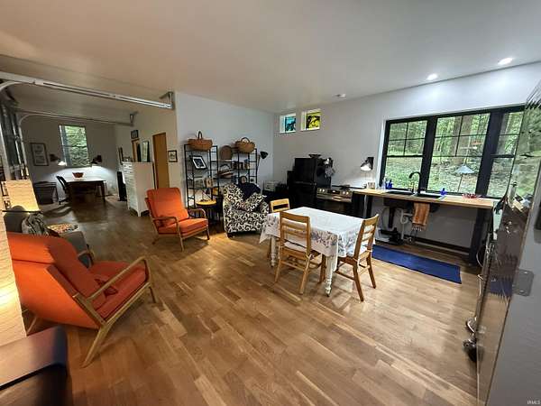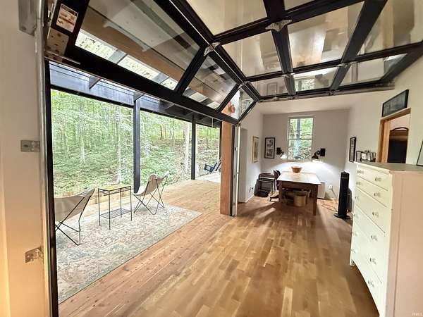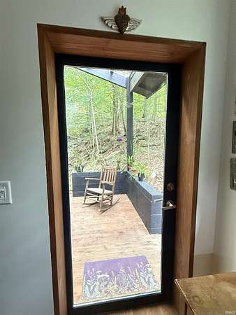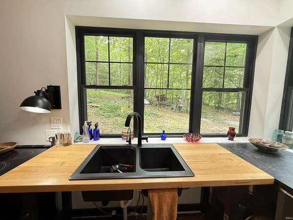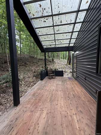 Custom-built home has beautiful surroundings with woodsy setting totaling 7.5 acres (double lot) and is an absolute showpiece! Artisan crafted, this home offers a sleek, modern, efficient design that makes an outstanding place to call home or could be a charming getaway. The home offers 2"x6" construction throughout. Custom windows, hardwood floors, industrial cabinetry add to the appeal. The modern glass garage door brings the woodsy views inside and one can enjoy the living space open air, if desired. Walk out to the expansive 'L-shaped' deck that is made from 1.25' native red cedar from Southern Indiana. Plenty of room for various seating that gives you a bird's eye view of the spring-fed creek and wildlife and even a space for a relaxing porch swing. The open concept makes great use of space, the 9ft ceilings and various windows add to the natural light and the appeal of the home. The home was thoughtfully designed for not only its visual appeal, but its energy efficiency. The home has rockwool insulation, foam insulation and have an R30 value in the exterior walls and air sealing of the structure was done to zip the system. The ceiling has 18" of cellulose insulation for an R60 value. There is a French drain from the southwest corner of the home to Blue Heron Road. This home does offer a double lot. So much to love at this contemporary home!