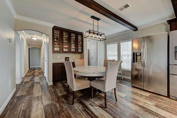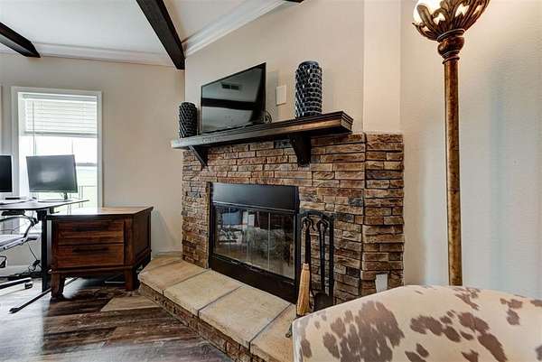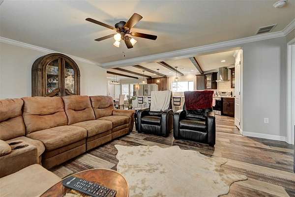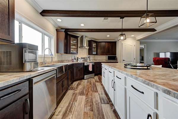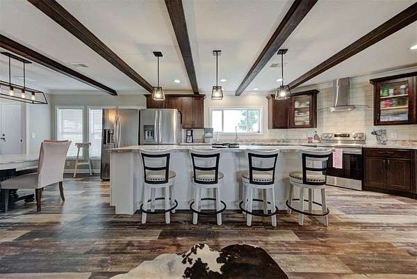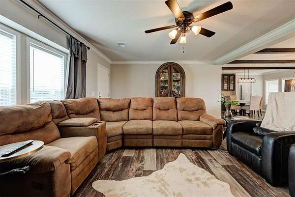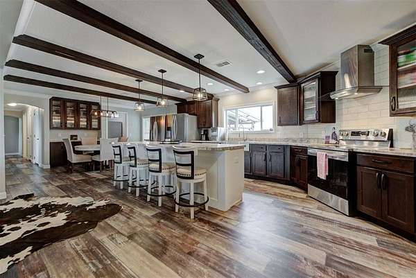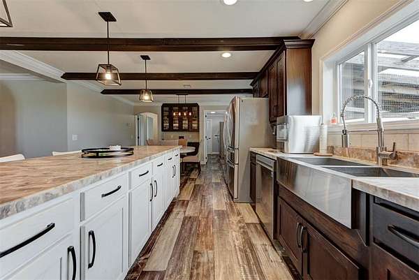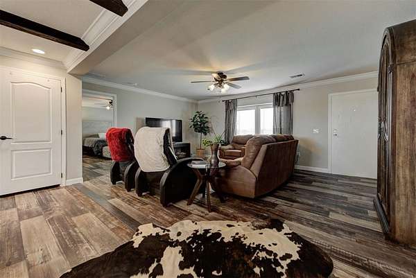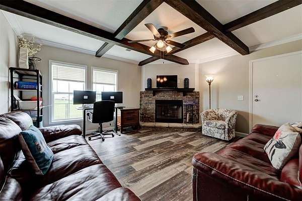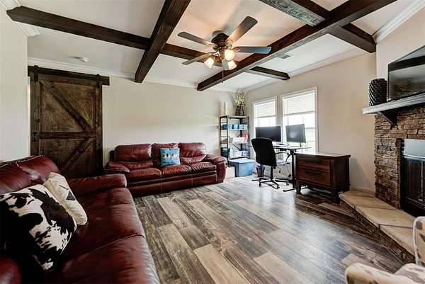 Arrive home via a private driveway and step into a spacious 4-bedroom, 2-bath home designed with comfort and style. Inside, you'll find two expansive living areas accented with wood beams and a cozy wood-burning fireplace. A sliding barn door separates the den, making it the ideal private office or man cave.