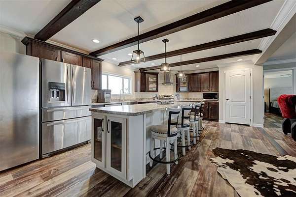 The open-concept kitchen boasts: A massive island, Soft-close cabinets and drawers, large pantry, ample storage, Breathtaking views from large windows that flood the space with natural light.