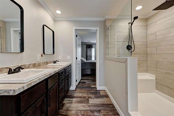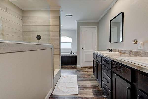 The bathrooms include oversized soaking tubs and a luxurious walk-in shower with a rain shower head. Throughout the home, you'll find durable wood-look flooring and thoughtful finishes that make it move-in ready.
