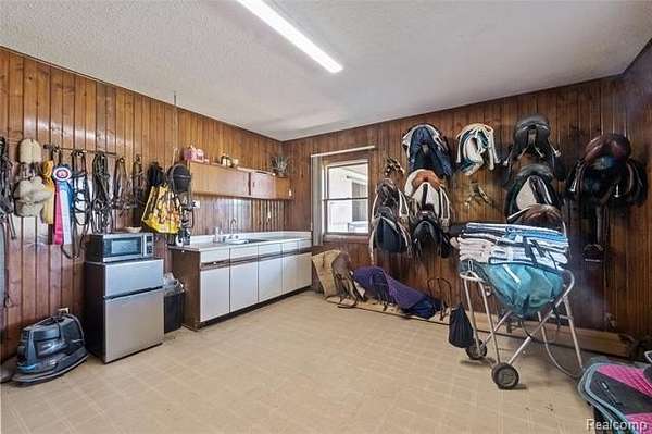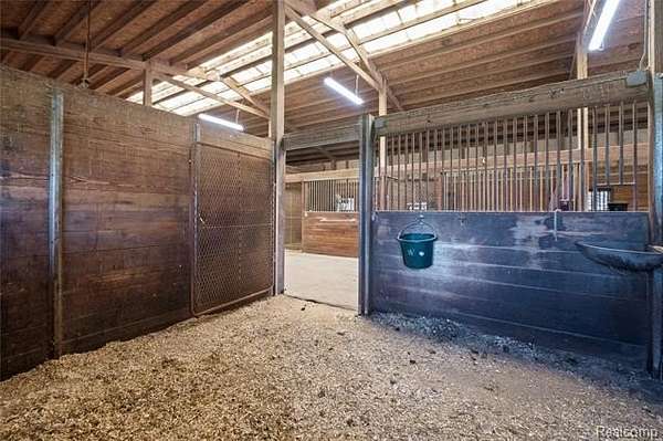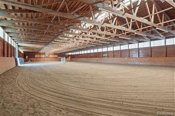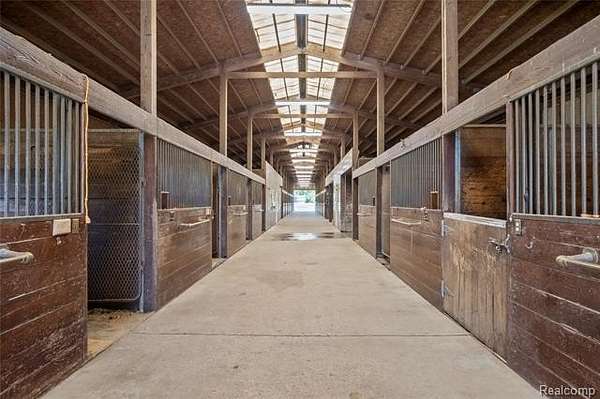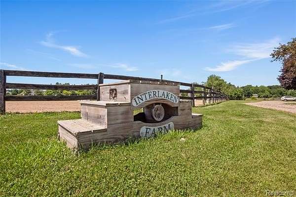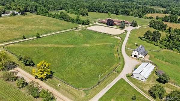 Seize the opportunity to acquire the well known 116 acre Interlaken Farm. Perfectly situated in the Metamora Hunt Country in Oxford, this grand equine facility is on one of the largest parcels of land currently available in Oakland County. Experience the diverse topography of this amazing piece of land with rolling meadows, 7 pastures, a small paddock, woods, trails and frontage on a small lake. Approximately 20 acres is currently in hay. Through the front entrance of the main barn is a large heated tackroom and office, both have dark stained tongue and groove paneling and picture windows overlooking the 150x240 outdoor arena and front pasture. A 1/2 bath and lounge complete this area. The 12 ft. main aisleway has 25 matted stalls (12X12), a double grooming area, wash rack with hot and cold water, a laundry room / workshop and feed room. The attached indoor arena is 70x180 and has an observation room that is currently being utilized as an apartment. Barn #2 (22x65) once a historic grainery was converted to a 5 stall barn with overhead hay storage and a 14x48 attached run-in shed. Barn #3 (40x85) is used for equipment storage has a workshop. Barn #4 (44x45), next to the 10x9 potting shed is used for storage. The 100+ year old farmhouse has 4 bedrooms and 2 full baths. A bright 4 season room overlooks the pasture and small apple orchard and leads to country kitchen and main floor laundry room. Some of the original hardwood floors remain. The farm has 2 wells, 2 septic's and is zoned agricultural. So much potential, bring your creativity, update this amazing property and make it your own. 24 hr. notice to show. All showings shall be accompanied by the listing agent.