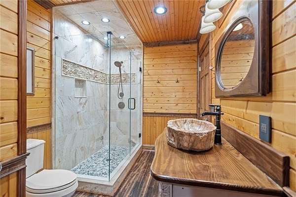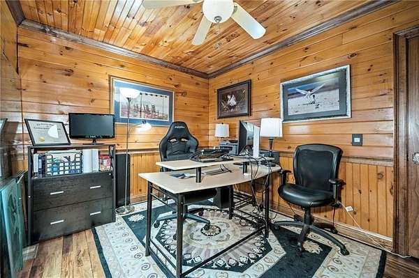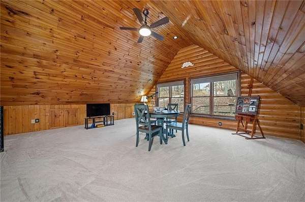 Lakefront log cabin retreat on Lake Lanier available for lease or for sale. This custom-built home sits on 1.61 private acres and blends rustic charm with high-end finishes throughout. The main level features soaring ceilings, exposed beams, rich hardwood floors, and a beautifully appointed chefs kitchen with Viking appliances, handcrafted cabinetry, and a hammered copper farmhouse sink. The open-concept great room offers peaceful lake views and an oversized stone fireplace. Two primary suites on the main level provide comfortable private bedroom spaces with spa-like baths. A third main-level bedroom, also suited for a home office, is conveniently located near a full bathroom. Upstairs, a cozy loft offers flexible space for work, reading, or relaxation. The finished basement includes a home gym, a spacious laundry room, and an additional bedroom. Outdoor living areas include multiple covered porches, expansive decks, and a newly built 3-car garage with ample storage. A lower garage and UTV paths make it easy to navigate the property. This home is ideal for renters seeking a peaceful, high-quality lakefront residence. Furniture is negotiable. Schedule your showing today!