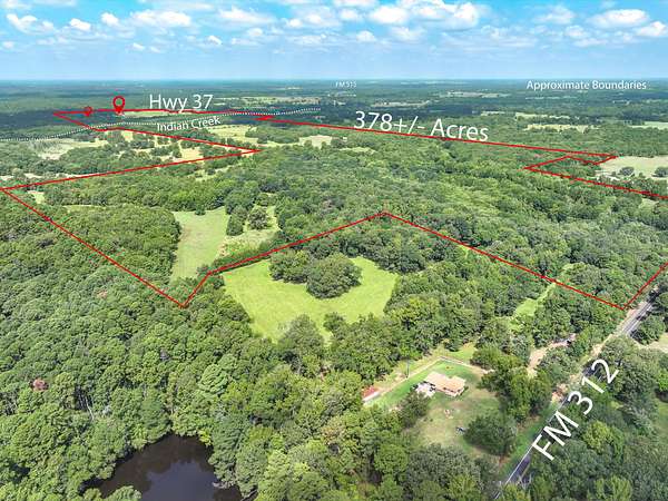 Improvements. Discover this rare large acreage tract featuring rolling pastures, fertile bottomland, a seasonal creek, multiple ponds, & abundant wildlife. With prime road frontage on both SH 37 & FM 312, this property offers excellent accessibility while maintaining the privacy & charm of a true country retreat. Main Residence: The centerpiece of the property is a 4BR-2.5BA lodge-style home with approx. 2,700 SF of living space. Highlights include: