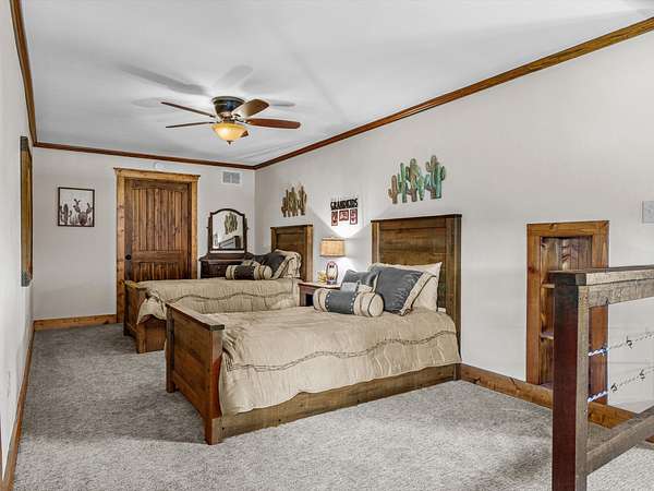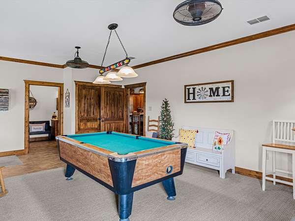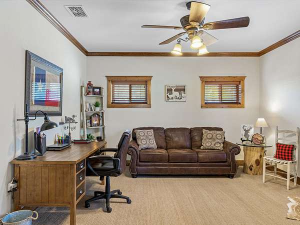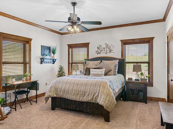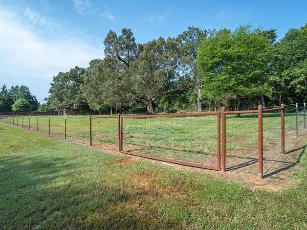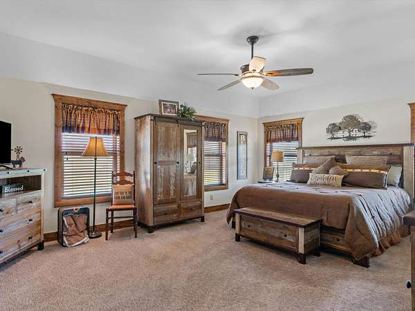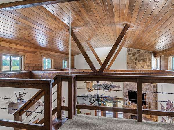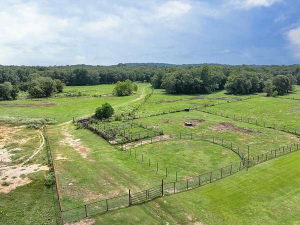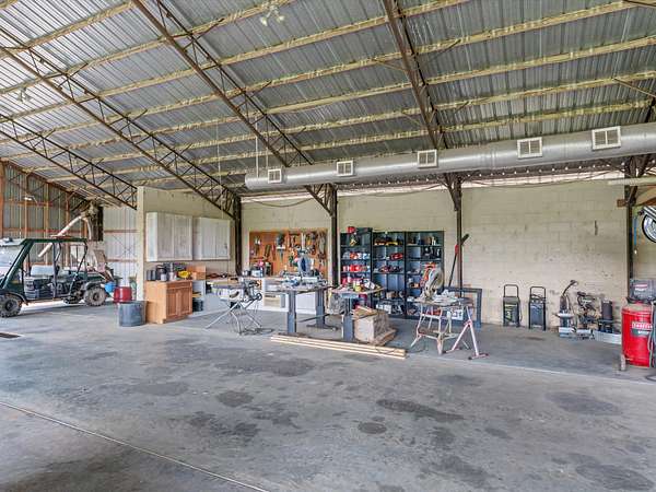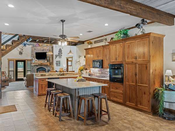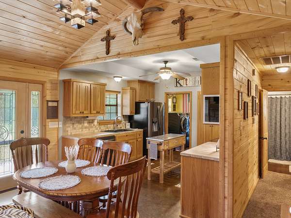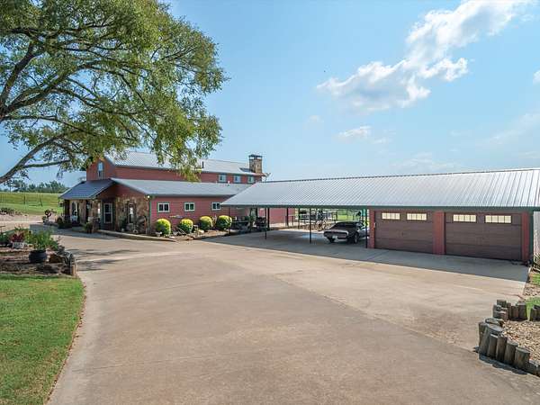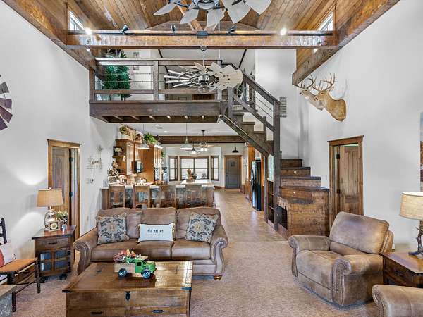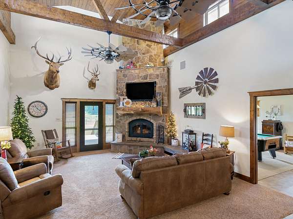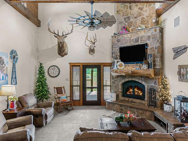 & custom wood finishes. Gourmet kitchen with large island, abundant counter space, dining bar, & walk-in pantry with built-in cabinetry. Massive living room with 19' vaulted ceilings, stone wood-burning fireplace, & exposed log trusses. Primary suite featuring 9' ceilings, a spa-style bath with dual vanities, custom tile walk-in shower, & oversized walk-in closet with built-ins. Additional living space, including a downstairs game room, ideal as a flexible 5th bedroom, & upstairs guest bedroom. Outdoor: Step outside to a private covered 49x15 entertainment deck with outdoor kitchen, propane cooking setup, ceiling & wall fans, + an extended deck with hot tub. The property is fully equipped for country living with 73x50 insulated shop with concrete floors, tack room, & adaptable livestock or horse facilities. RV pad with hookups, well house, backup generator, cattle working pens, chicken coop, storage buildings, & plant room.Second Home across the dam of the property's scenic lake lies a 2006 built 3BR-1BA with 1200 SF perfect for extended family or guests. A covered 320 SF front porch with panoramic views, attached 528 SF carport with storage. Land & Wildlife: Rich mix of pasture, creek-front areas, & bottomland create excellent opportunities for livestock, hunting, or recreation. Wildlife is plentiful, & the land offers practical agricultural productivity.