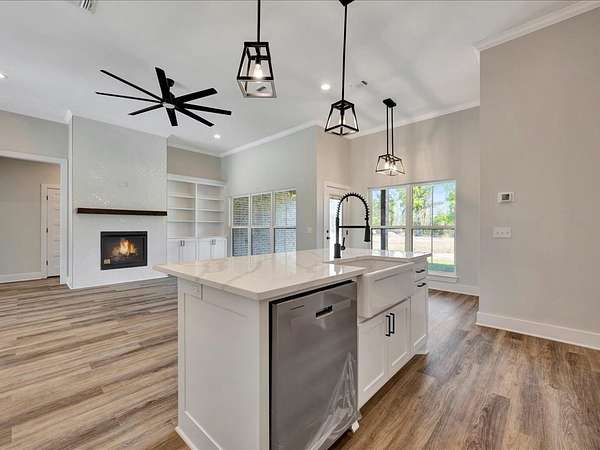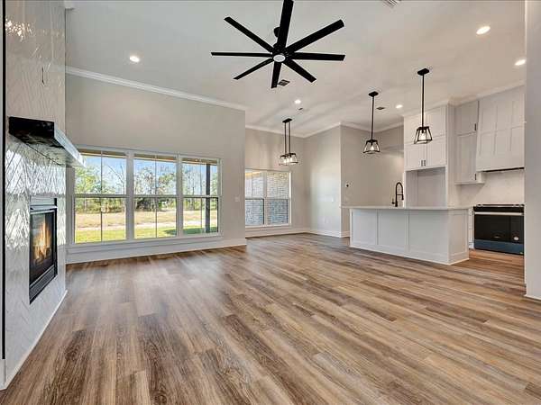 Discover the perfect mix of modern style and country charm in this stunning new construction on 1.5 acres! This 4-bedroom, 2.5-bath home offers a bright, open floor plan designed for comfort and function. The island kitchen overlooks the inviting family room with a cozy wood-burning fireplace—ideal for gatherings. The split-bedroom layout provides privacy, featuring a spacious primary suite with a spa-like bath that includes a soaking tub, walk-in shower, and dual vanities. Stylish vinyl plank flooring runs throughout, complemented by wood ceilings in the dining area and primary bedroom plus elegant crown molding. Enjoy outdoor living on the covered patio, perfect for relaxing or entertaining. The double attached garage adds convenience, while the expansive lot gives you plenty of room to roam. Don't miss this beautifully crafted home that blends modern design with timeless charm! Click the virtual tour links for a staged video and interactive floor plan.