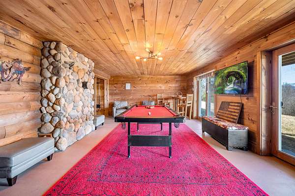 Welcome to your private Vermont retreat—where mountain views, open skies, and timeless log-style charm come together on 25.57± acres of serene countryside. This beautifully crafted 3-bedroom home, including a spacious primary suite, and a loft, offers the perfect blend of rustic elegance and modern comfort. Step inside to a soaring cathedral ceiling and a warm, inviting living space anchored by a gas fireplace, ideal for cozy evenings year-round. The kitchen features granite countertops, complemented by tile flooring; and hardwood and carpet flooring throughout the home, adding both character and comfort. Enjoy your morning coffee with stunning east south east views, with glimpses of water and breathtaking mountain scenery that change with every season. The walkout lower level offers a versatile recreation space—complete with a pool table—perfect for entertaining, relaxing, or hosting guests. A dedicated laundry area and ample storage add convenience. Outside, the lifestyle truly shines with established apple trees, private acreage, 2 car attached garage, and a 2 car detached barn with loft. Whether you're seeking a full-time residence, a retreat, or a property with room to expand your vision, this one delivers. All of this and the furnishings!