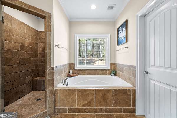 - Double Vanity, High Ceilings, Master On Main Level, Separate Shower, Soaking Tub, Tile Bath, Walk-In Closet(s)