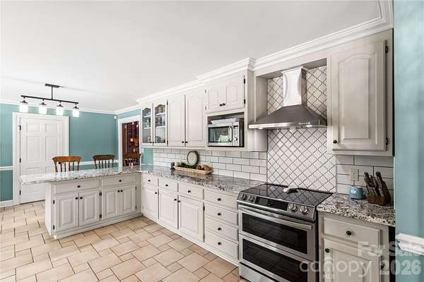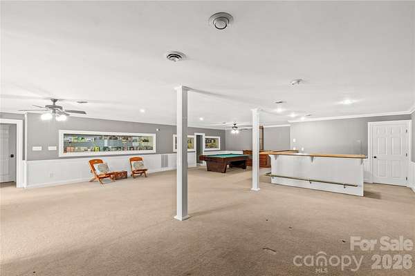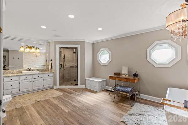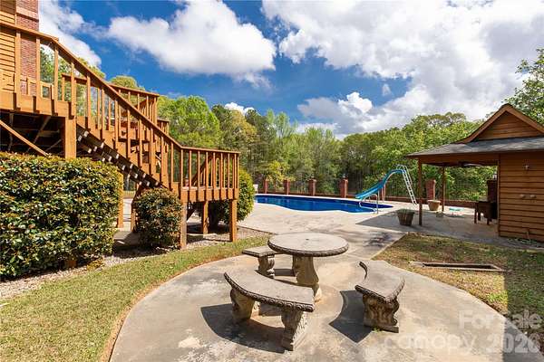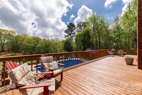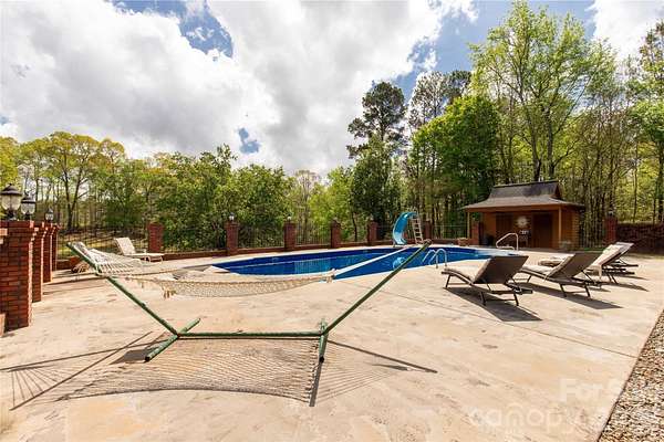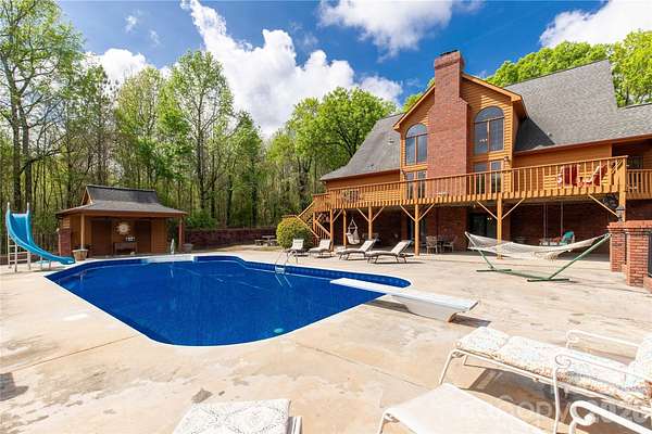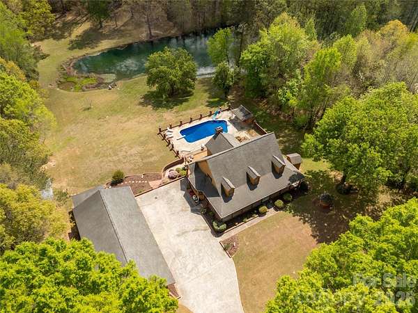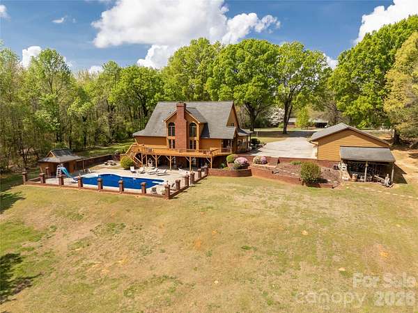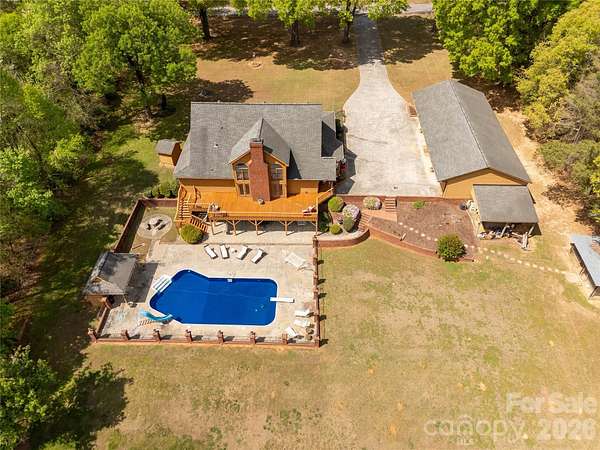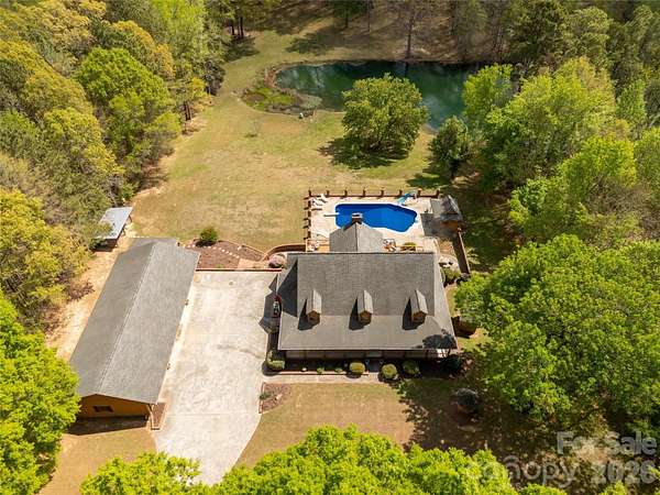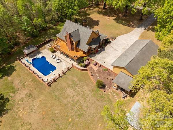 Welcome to a truly rare luxury estate set on over 3 acres, offering more than 5,600 heated square feet designed for those who crave space, privacy, and a resort-style lifestyle. Ideally located just minutes from Charlotte, this exceptional property offers the perfect balance of convenience and seclusion, creating a true private retreat. Tucked into a peaceful setting, this custom wood-sided home makes an unforgettable first impression with its long driveway, manicured grounds, and inviting wraparound front porch-the perfect place to slow down and take in the surroundings, where it's not uncommon to spot wild turkeys wandering through the backyard. Inside, the home opens to a stunning two-story great room anchored by a statement fireplace and framed by double French doors that lead to an expansive back deck. From here, the view unfolds into a private outdoor oasis featuring a sparkling in-ground pool with a diving board and slide, along with a stocked pond that enhances the serene, getaway-like atmosphere. The main level is thoughtfully designed for both comfort and flexibility, featuring a spacious primary suite that sets a new standard for relaxation with its spa-like bath, complete with a soaking tub, dual granite vanities, built-ins, a large walk-in ceramic shower, and the added luxury of two walk-in closets. The main floor also includes a well-appointed kitchen and a flexible bedroom or office space, making it ideal for remote work or guests. Upstairs, two additional bedrooms, a full bath, and a loft overlook the pool and pond, creating a picturesque setting for a second living area, reading nook, or media space. The walk-out basement is perfectly suited for extended living or entertaining, offering an expansive recreation room with built-in trophy and display cases, a wet bar, billiards area, fireplace, half bath, and a dedicated workout room. With direct access to the pool deck, this level provides excellent potential for multi-generational living, guest quarters, or a private retreat within the home. Outdoors, the property continues to impress with a large back deck, a beautifully maintained fenced yard, and carefully curated landscaping accented by brick columns, hardscaping, and wrought iron details. Additional structures include a pool house, a four-bay detached garage, and dog kennels, providing both functionality and flexibility for a variety of lifestyles. With walk-in attics, custom built-ins throughout, and every detail designed with intention, this home offers the perfect blend of luxury, space, and versatility. For those seeking a private estate with acreage, a pool, a pond, and room to accommodate multi-generational living-all within minutes of Charlotte-this is a rare opportunity to own a property that truly feels like a destination.