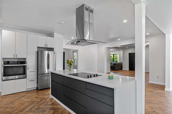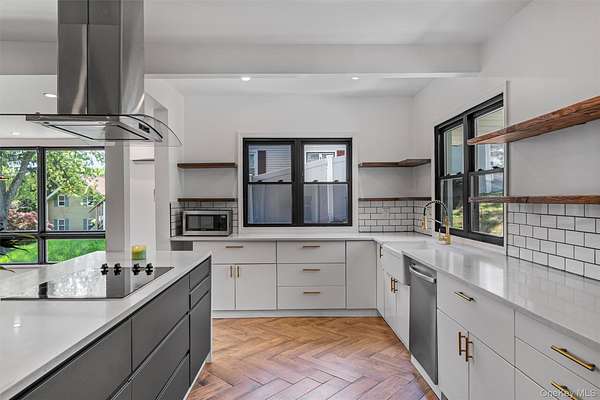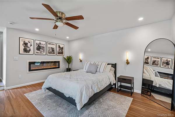 The renovated kitchen is both attractive and practical, with a generous center island for casual dining. It features dark gray and white cabinetry, quartz countertops, open shelving, classic subway tiles, and modern appliances, including a sleek cooktop with hood. Retreat to the primary suite, complete with an electric fireplace, soothing lighting, and a spa-like ensuite. Updated bathrooms showcase custom tile work, matte black fixtures, and a glass-enclosed shower. All bedrooms provide ample space and thoughtful modern touches.