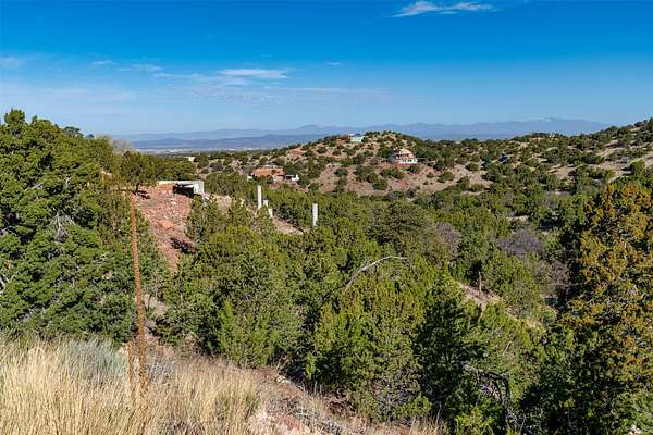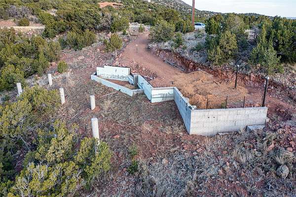Elevated Sunlit Hills view-lot, 5.5. acres, with foundation and development work completed, and plans for a 1648 square foot contemporary two-bedroom, two-bathroom home included. Finish this home or use the work done here for a significant head-start on your own vision. This quiet hillside acreage is just minutes from town, and on a paved road, a rarity in Sunlit Hills, and opens to expansive views and sunsets over the Jemez. Much of the engineering, prep-work and necessary infrastructure to make the best use of this property has already been completed: The driveway and the site have been engineered and graded from Camino Pacifico. Excavation has been completed and utilities are in place. A water connection to the Sunlit Hills Water system was created, the electricity is trenched, with a transformer and meter installed, and the foundation and stem walls constructed, along with a buried water catchment system. Advanced septic system has been installed. Seller investment in utilities and site-prep exceeds $120,000. Additional space for a shop, casita, or studio may be possible on lower sections of the lot that are gently sloped.
