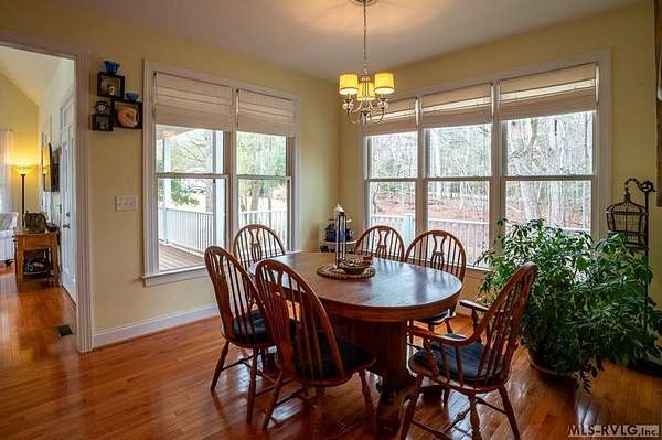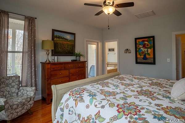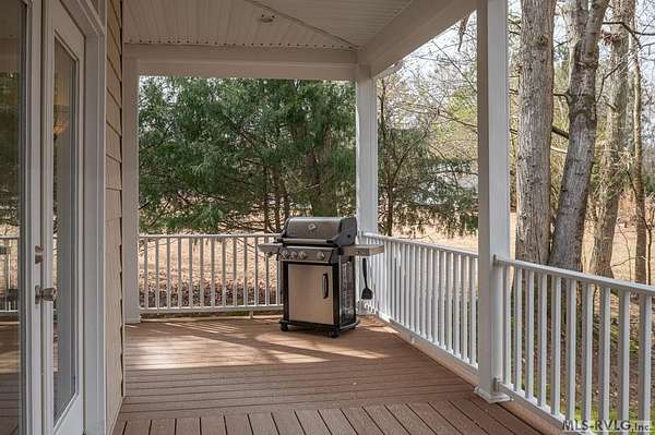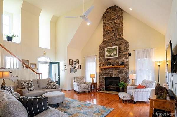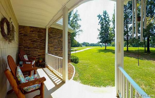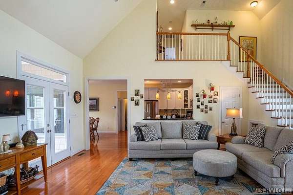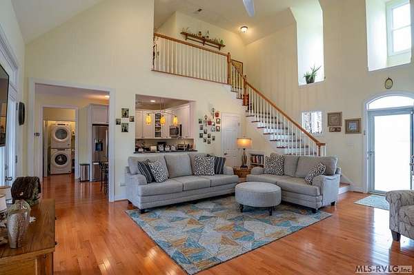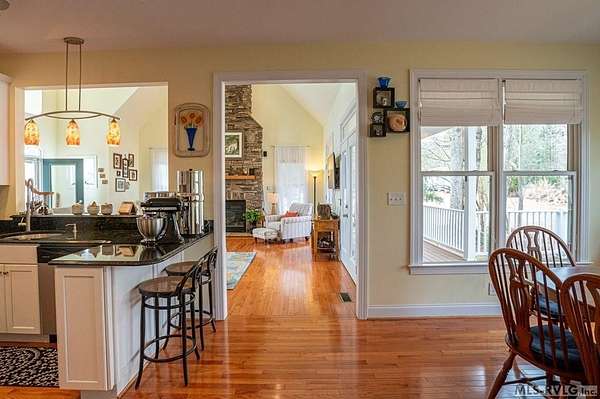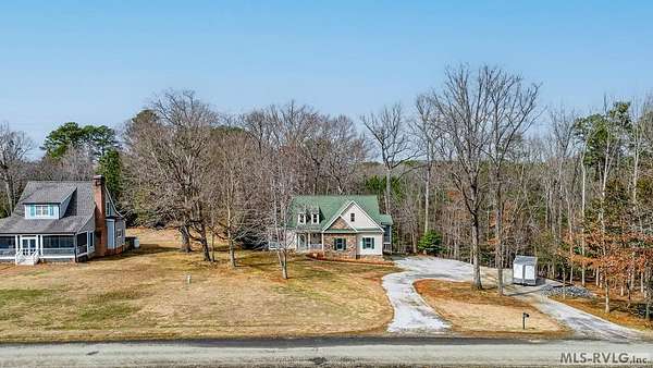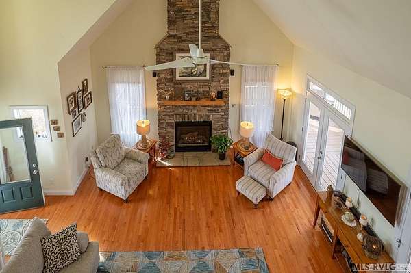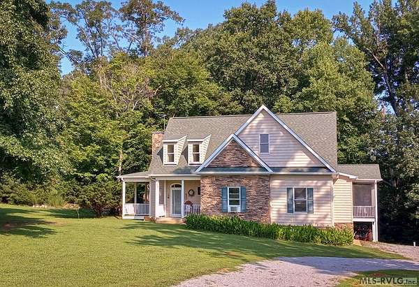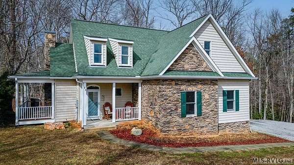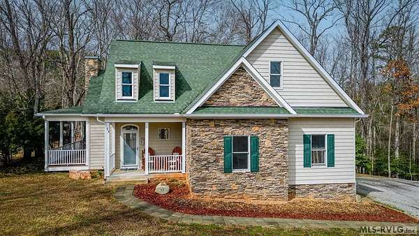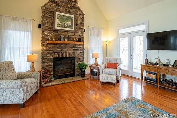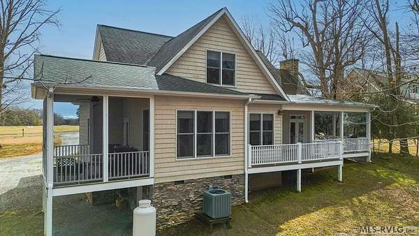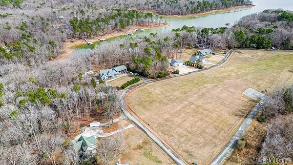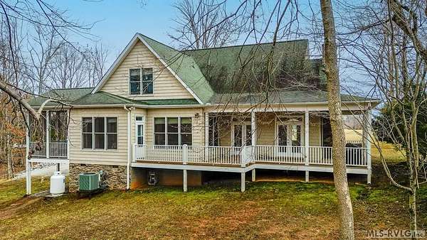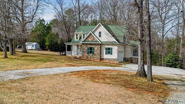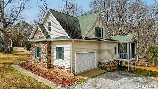 Welcome to Merifield Acres, a peaceful lake community alongside Buggs Island/Kerr Lake. Your new home is stunning in both its features and craftsmanship. This gorgeous home features a large 1.52 acre double lot, 3bd/2ba, and nearly 1,800 sq. ft. with a wraparound deck. Inside, vaulted ceilings in the living room makes an impression with a gorgeous floor-to-ceiling stone fireplace with gas logs. The hardwood floors flow across the main level and natural light fills the space, creating an inviting atmosphere. The first-floor primary suite provides convenience, privacy and access to a screened porch overlooking the peaceful woods; a perfect place to enjoy your morning coffee and breathtaking sunrises. The ensuite bath has double vanities, soaking tub, shower, and walk-in closet. The laundry, half bath, and two-car garage entry round out the main level. Upstairs, has 2 spacious bedrooms, 1 bath, and bonus room ideal for a office, playroom, exercise room, or guest space. The front porch is a place to enjoy bald eagles that soar above the private airfield. The community dock and park are just around the corner. Historic Clarksville is minutes away. Begin your Lake Life dream today!