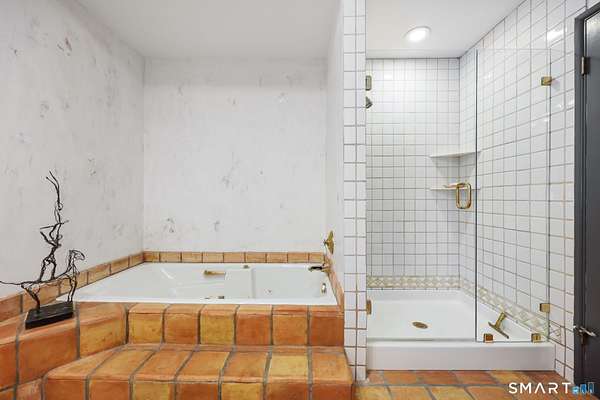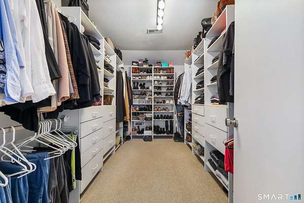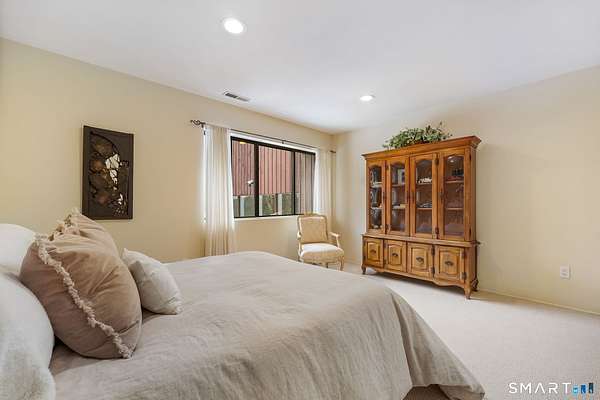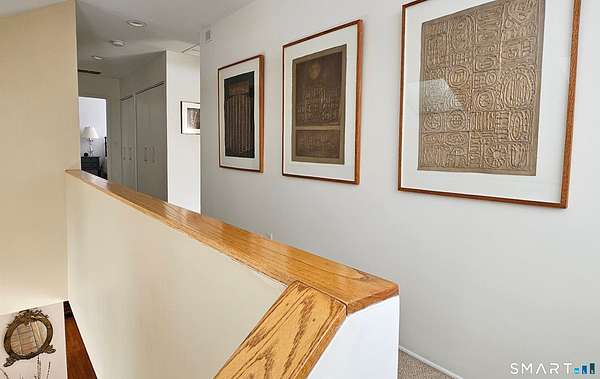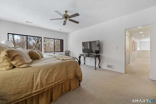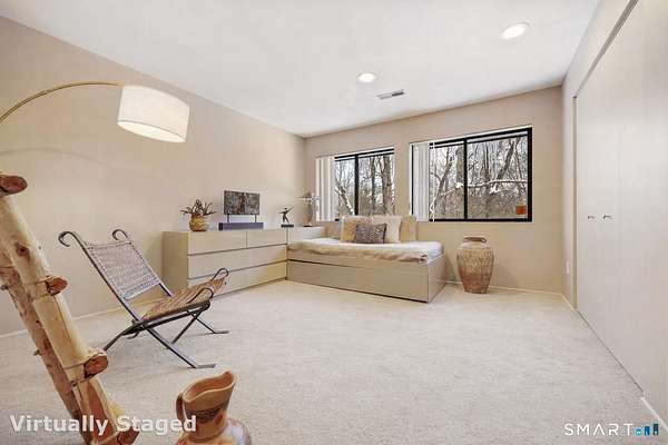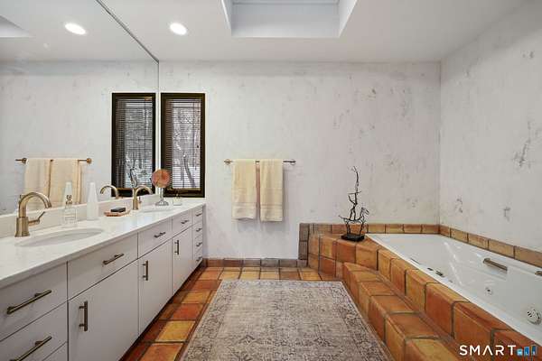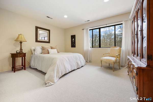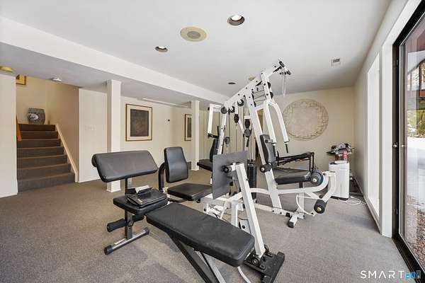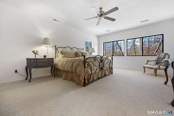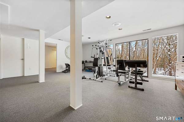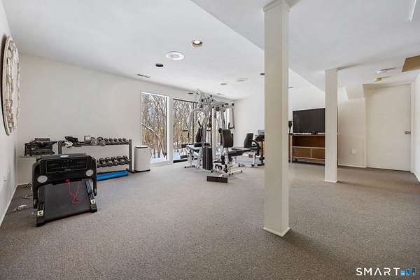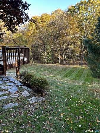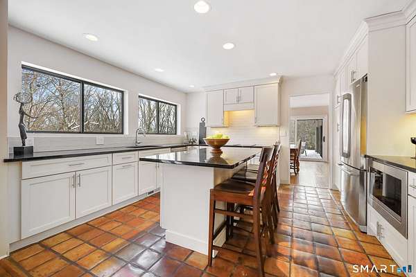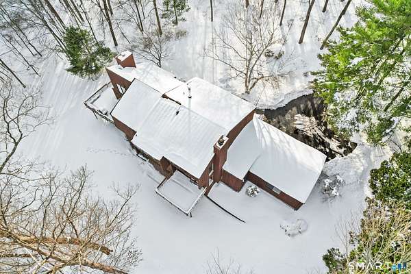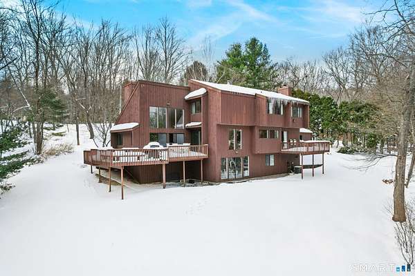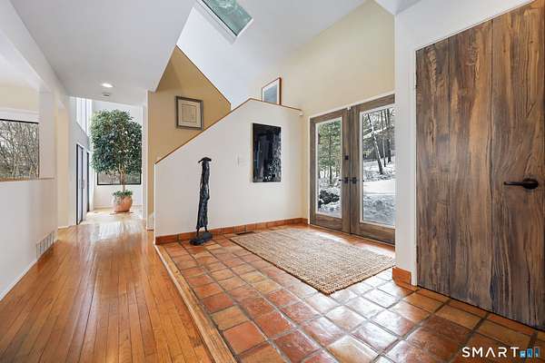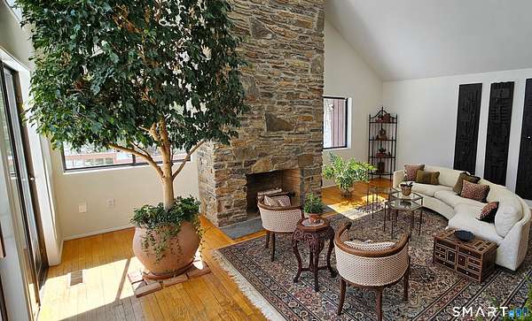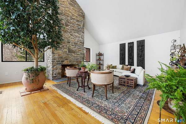 Welcome to 53 Rock Hill Road in Woodbridge - privately set back from the end of the cul-de-sac, this stunning contemporary colonial exceeds expectations while radiating warmth and comfort. From the moment you arrive, a gracious two-story foyer creates an open, airy first impression, anchored by warm Saltillo tile that introduces the home's refined aesthetic. Sightlines extend through the interior to a tranquil backyard framed by mature trees and manicured grounds creating a peaceful natural retreat. Expansive windows - many floor-to-ceiling - along with multiple sliding doors invite the outdoors in and bathe the interior in natural sunlight. A dramatic floor-to-vaulted-ceiling fireplace, constructed from natural fieldstone sourced directly from the property, defines the living room and serves as a striking yet intimate focal point suited for both everyday living and entertaining. Ideally positioned between the living room and kitchen, the dining room is bright and welcoming, with sliding doors that open to the wrap-around deck overlooking the park-like setting. Its placement allows for effortless social gatherings while remaining equally comfortable for daily meals.