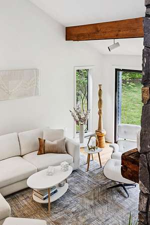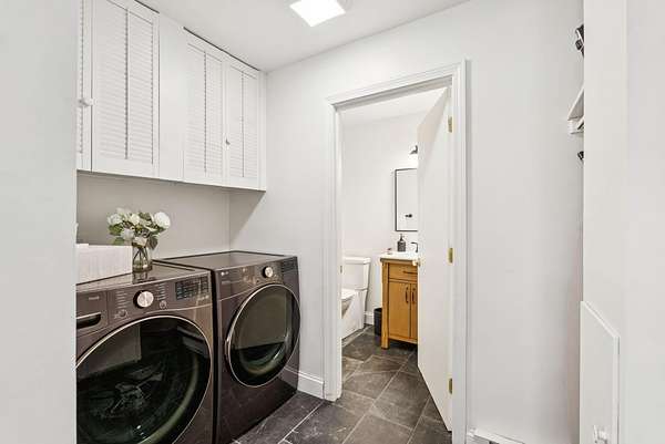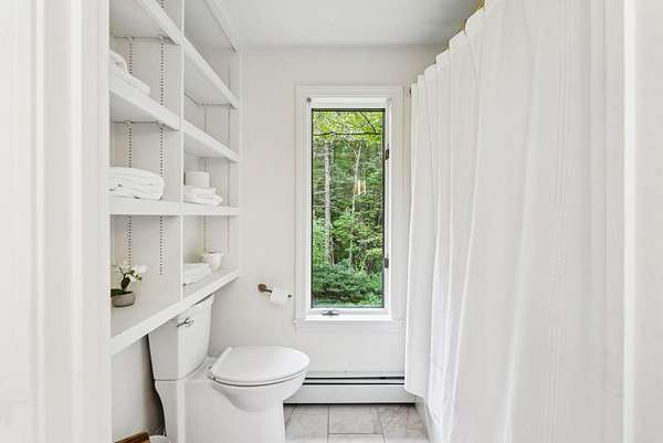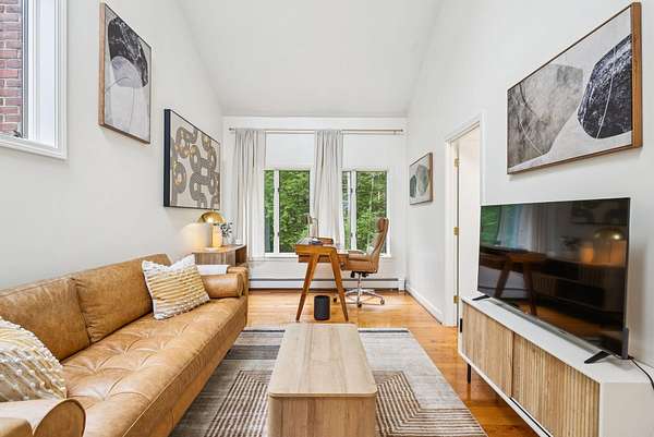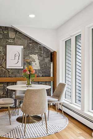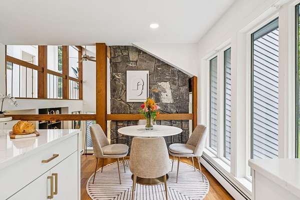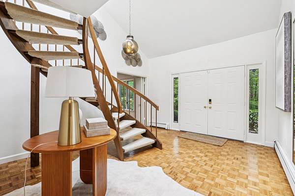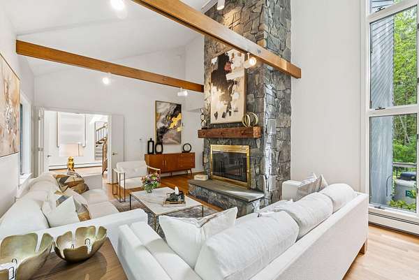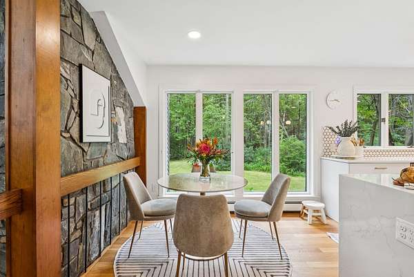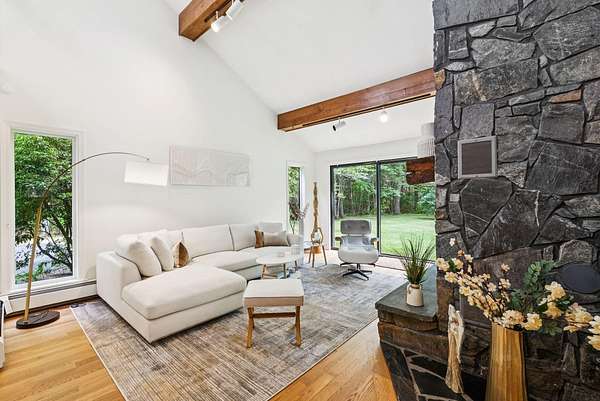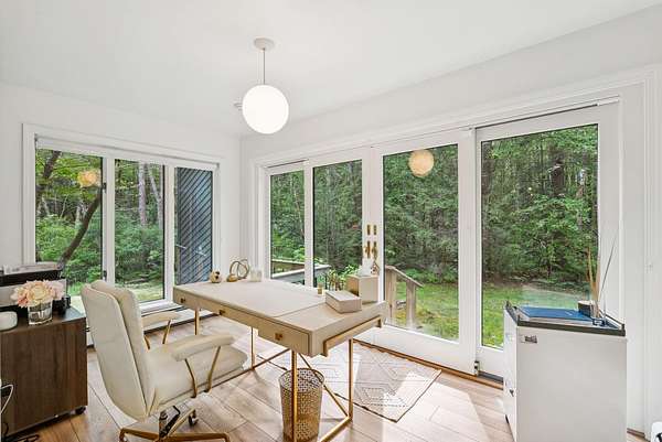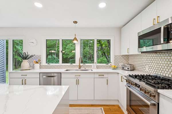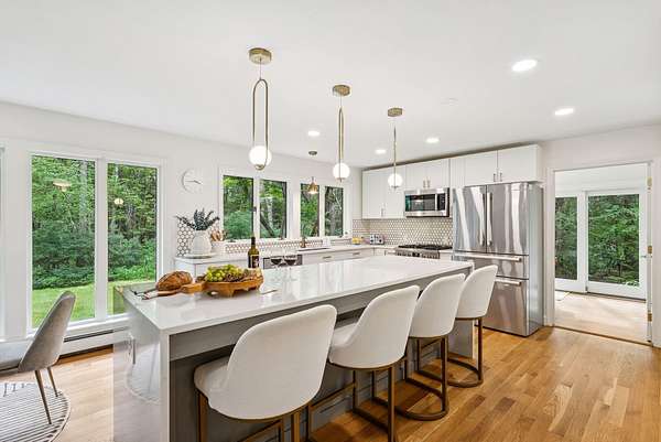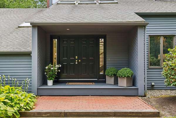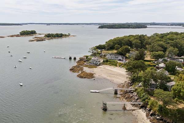 NEW Significant Price Improvement: Recently reduced by $240,000 from $2,175,000. Privately set on three wooded acres in the coveted Falmouth Foreside, 53 Waites Landing offers a rare combination of space, privacy, and designaEUR"just moments from the ocean, golf, shopping, and downtown Portland. This 5-bedroom, 3.5-bathroom contemporary has been thoughtfully reimagined for modern living, with an expansive layout that includes in-law quarters, distinct living rooms, and two full kitchensaEUR"ideal for multigenerational living, hosting long-term guests, or accommodating flexible lifestyle needs. The home's mid-century inspiration is expressed in vaulted ceilings, walls of glass, and two floor-to-ceiling stone fireplaces that anchor light-filled gathering spaces. The main kitchen was fully renovated with a nine-foot quartz waterfall island, Bosch appliances, matte cabinetry, and gold-accented honeycomb marble tile, opening seamlessly to the dining and living areas. Extending off the kitchen, a sunroom or office offers peaceful year-round views of the surrounding woods. Upstairs, the primary suite includes a renovated bath, walk-in closet, and an adjoining sitting roomaEUR"perfect as an office, nursery, or potential fifth bedroom. Three additional bedrooms share a full bath with double vanities. The daylit lower level features a second kitchen, full bath, living room with JA,tul wood stove, and a glass solarium-style corridor with its own private entranceaEUR"well-suited for guests, in-laws, an au pair, or a dedicated workspace or gym. Recent updates include refinished and new hardwood floors, updated baths, new appliances, fresh interior and exterior paint, a Buderus heating system with new hot water heater and oil tank, and landscaping and masonry. This is a rare opportunity to own a private retreat on Waites Landing, one of Maine's most prestigious and quiet waterfront neighborhoods. Beach access is not deeded and may be granted through an annual invitation to assist with cleaning.