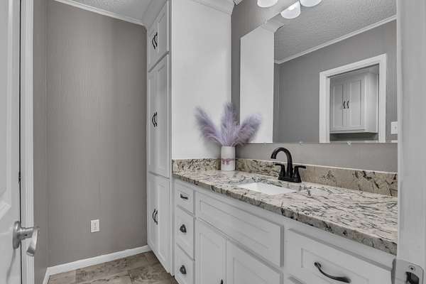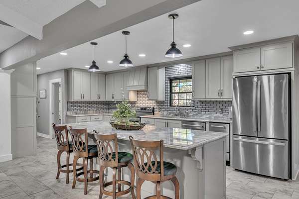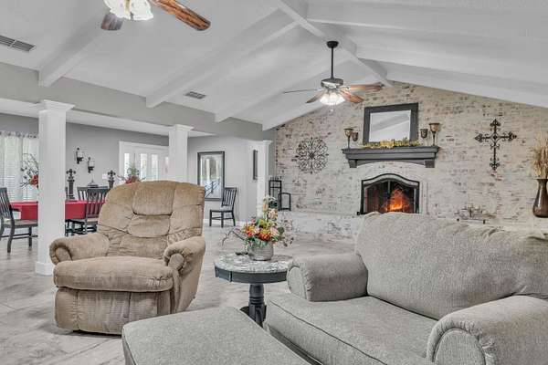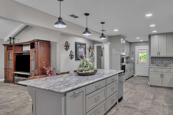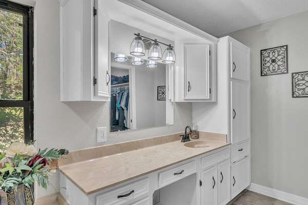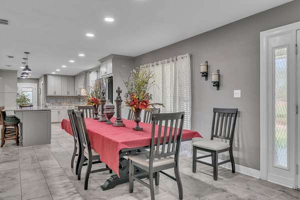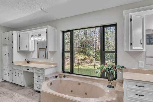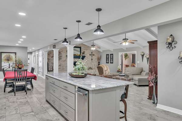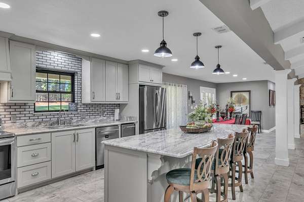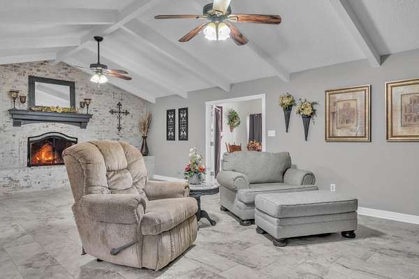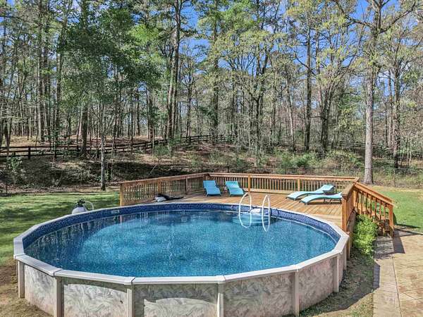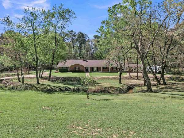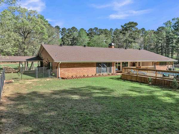TRADITION MEETS MODERN INTERIOR UPDATES, and the home is perfectly positioned on a beautifully tree-lined 3.05-acre homesite. Are you looking for a Dream Kitchen? Look no further, this home offers high-end appliances, granite countertops, a large eating bar, ample storage, and a walk-in pantry. The Kitchen/Dining overlooks a spacious living room. This large family room has a vaulted beam ceiling and a custom fireplace. There is additional living space accessible through the French doors, which is ideal for a game room. The Primary bedroom is exceptionally large with a vaulted ceiling and has an ensuite with a walk-in shower, garden tub, dual vanities, and walk-in closets. There is a separate spacious bedroom with an ensuite shower near the kitchen area, and two more large bedrooms, a hall bath, and convenient access to the garage, laundry, half bath, and office on the opposite side of the living room space. The entire home is floored with a beautiful, stylish ceramic tile for easy cleaning and functionality. When the weather warms up, this home has a place to cool down so enjoy the above-ground pool with a large deck to accommodate patio furniture. This home's country atmosphere is so tranquil and so easy to commute to Longview's amenities. The best of both worlds. Come see for yourself.