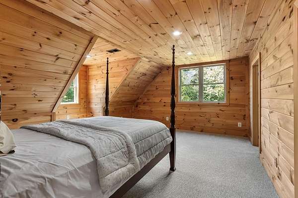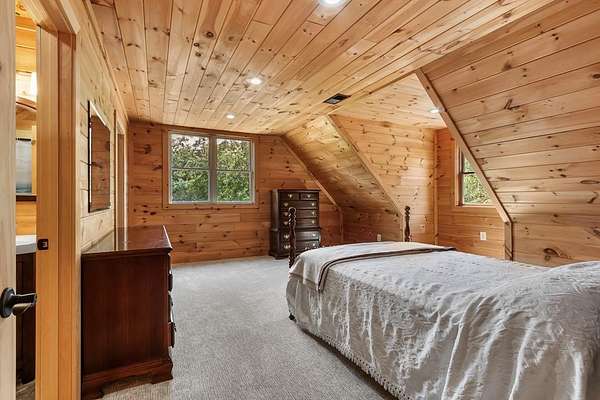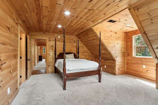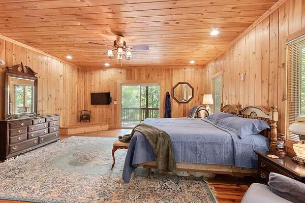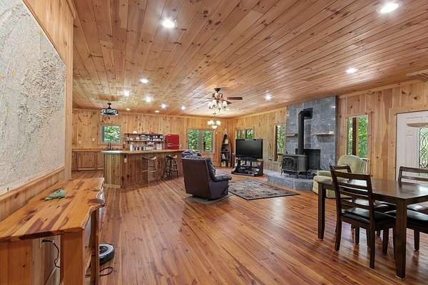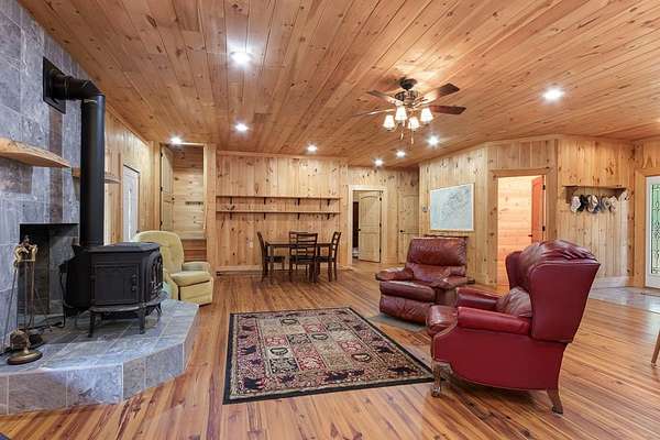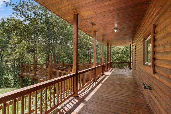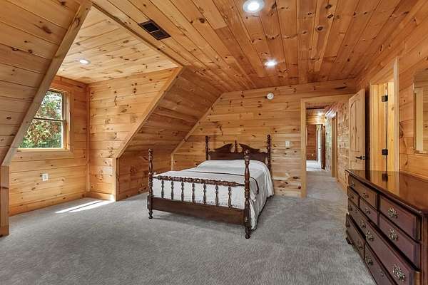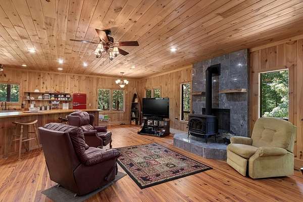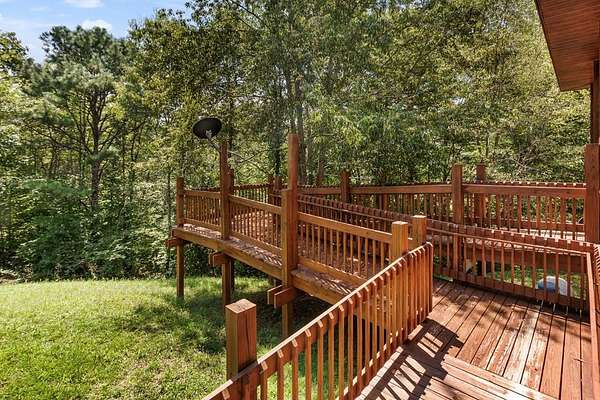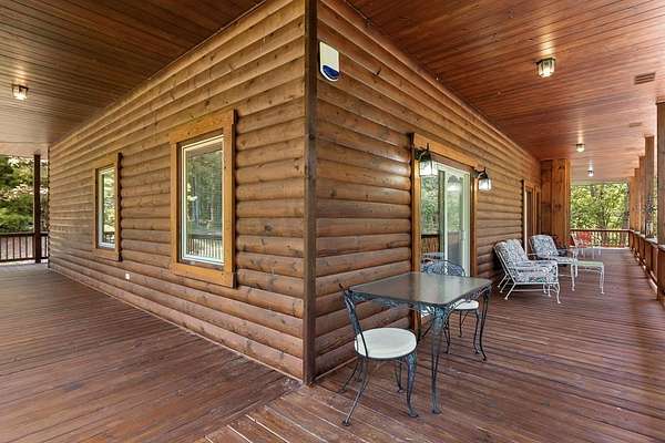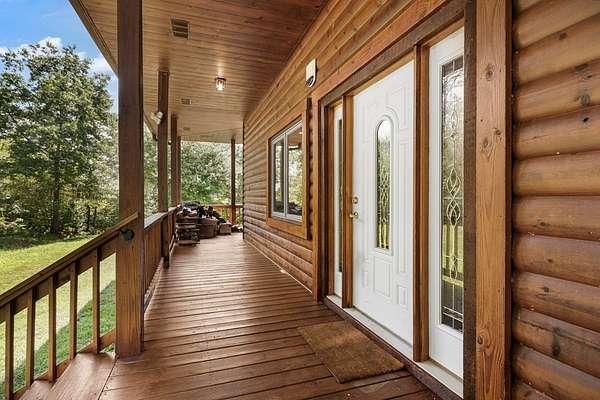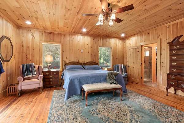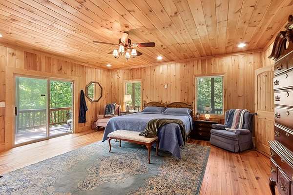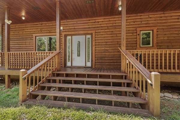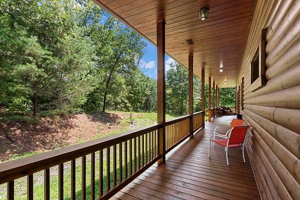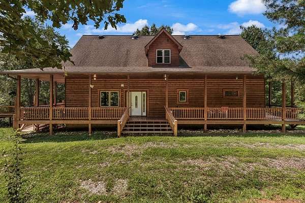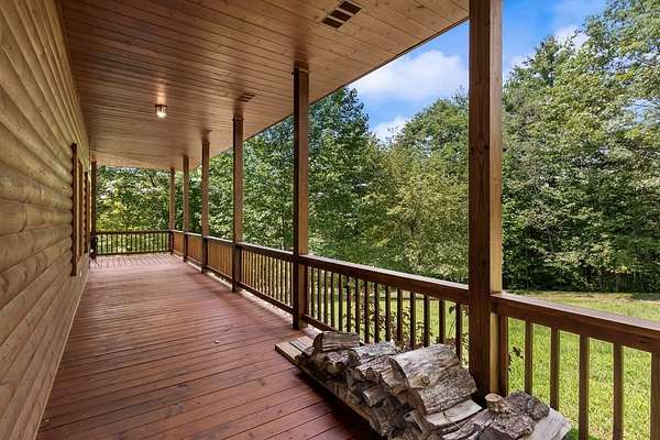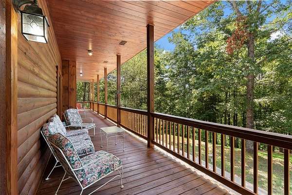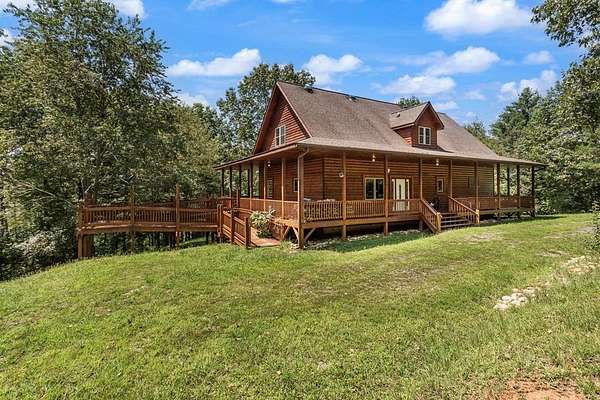Tucked away on nearly 7 acres of unrestricted wooded land with no HOA, this stunning 4-bedroom, 3 full bath, 2 half bath log-sided cabin offers the ultimate privacy, freedom, and rustic charm. A long private driveway winds beneath a canopy of hardwoods, leading to a welcoming home wrapped on all four sides by a wide covered porch with an 80' ramp, and to enjoy every angle of this stately home. Step inside your foyer, with locally sourced marble floor - the very same marble that's on the Cherokee County courthouse! - and into the expansive Great Room, where wood ceilings, warm heart-pine wood floors, and a cozy wood-burning stove framed by a tile hearth to create a true mountain lodge feel. The open kitchen impresses with an oversized island, abundant cabinetry, open shelving, and a bold red retro-style refrigerator. The main level also features a convenient half bath with marble floor, laundry with sink, and the first of THREE MASTER SUITES with dual walk-in closets, private porch access, and a spa-like bath with tiled shower, garden tub, and marble floor. Upstairs are a second bedroom, a bonus room, and two additional Master Suites with ensuite baths. The lower level expands the possibilities with a partially finished recreation room, two sets of glass doors to a patio, a half bath, and another large bonus room with outdoor access. Whether you envision a private mountain retreat, short-term rental, or forever home, the unrestricted land gives you endless options--add a garage, build a workshop, bring your RV, or simply enjoy peace, seclusion, and the freedom to make this mountain property your own. And with high-speed Fiber Optic internet, you're always connected! Call us today for more details, pictures, and maps of the property.