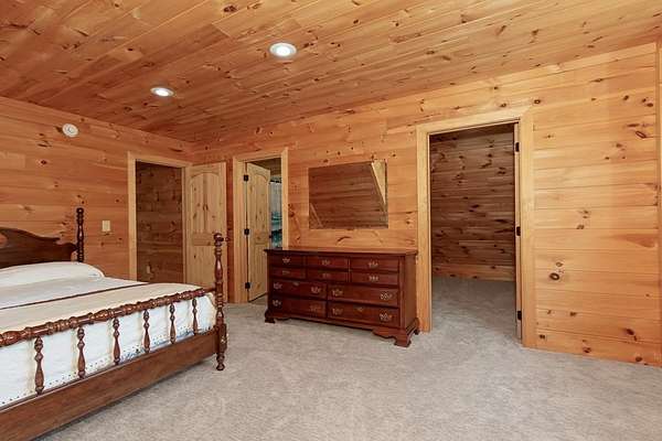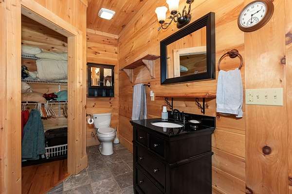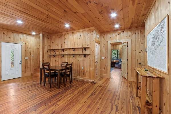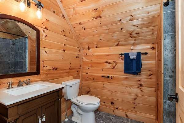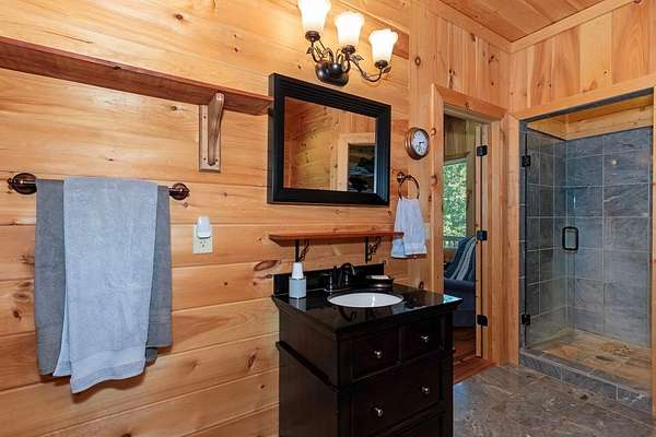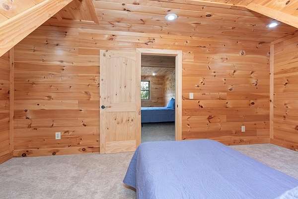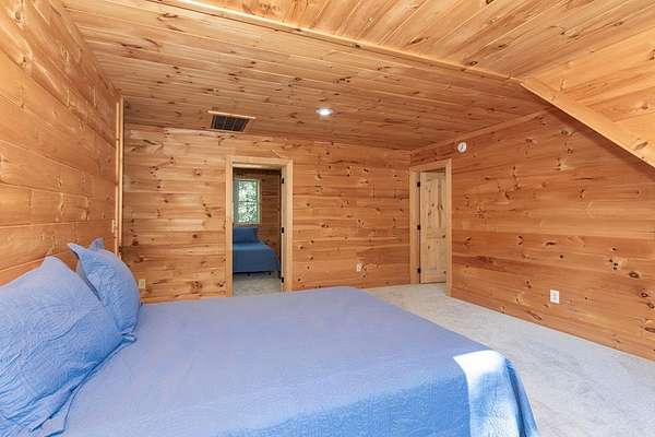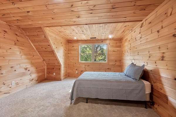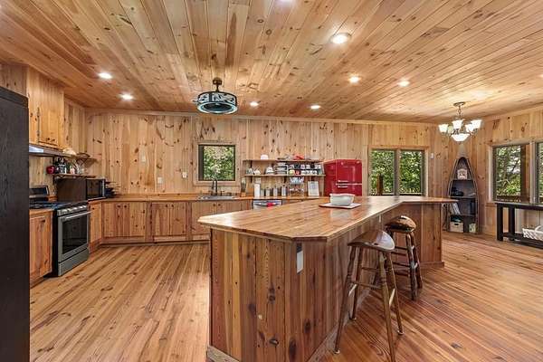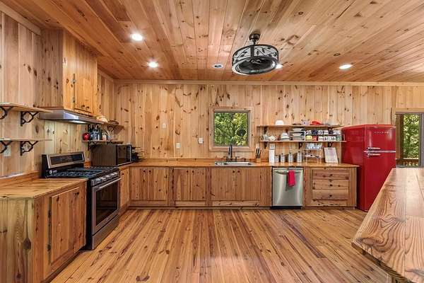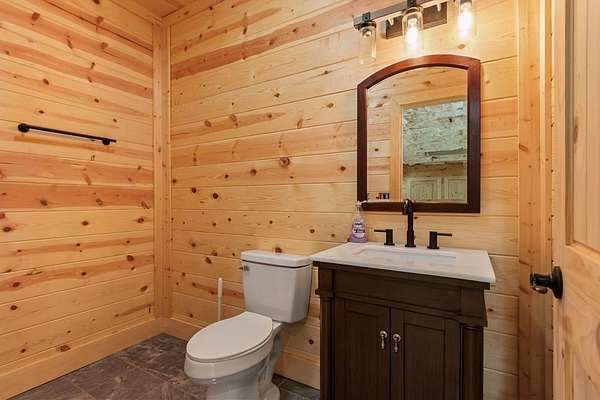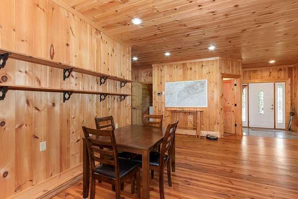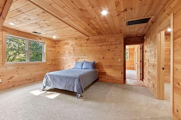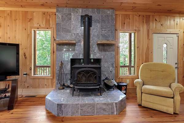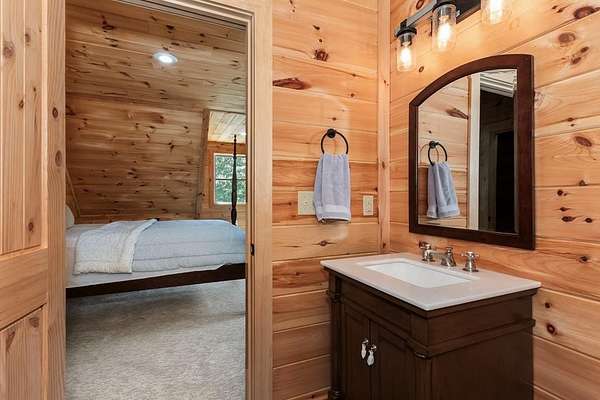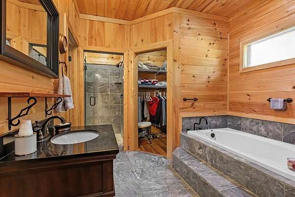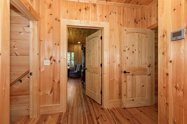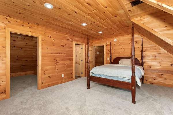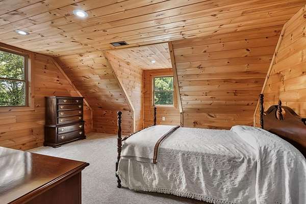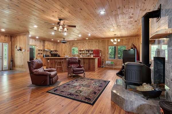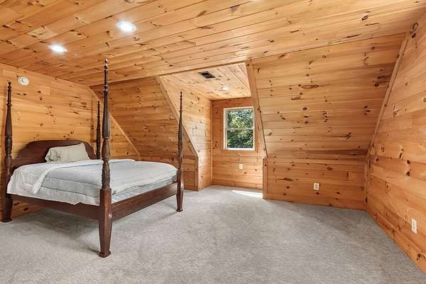 Tucked away on nearly 7 acres of unrestricted wooded land with no HOA, this stunning 4-bedroom, 3 full bath, 2 half bath log-sided cabin offers the ultimate privacy, freedom, and rustic charm. A long private driveway winds beneath a canopy of hardwoods, leading to a welcoming home wrapped on all four sides by a wide covered porch with an 80' ramp, and to enjoy every angle of this stately home. Step inside your foyer, with locally sourced marble floor - the very same marble that's on the Cherokee County courthouse! - and into the expansive Great Room, where wood ceilings, warm heart-pine wood floors, and a cozy wood-burning stove framed by a tile hearth to create a true mountain lodge feel. The open kitchen impresses with an oversized island, abundant cabinetry, open shelving, and a bold red retro-style refrigerator. The main level also features a convenient half bath with marble floor, laundry with sink, and the first of THREE MASTER SUITES with dual walk-in closets, private porch access, and a spa-like bath with tiled shower, garden tub, and marble floor. Upstairs are a second bedroom, a bonus room, and two additional Master Suites with ensuite baths. The lower level expands the possibilities with a partially finished recreation room, two sets of glass doors to a patio, a half bath, and another large bonus room with outdoor access. Whether you envision a private mountain retreat, short-term rental, or forever home, the unrestricted land gives you endless options--add a garage, build a workshop, bring your RV, or simply enjoy peace, seclusion, and the freedom to make this mountain property your own. And with high-speed Fiber Optic internet, you're always connected! Call us today for more details, pictures, and maps of the property.
