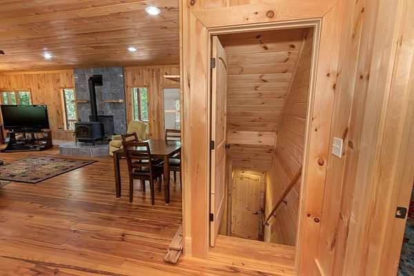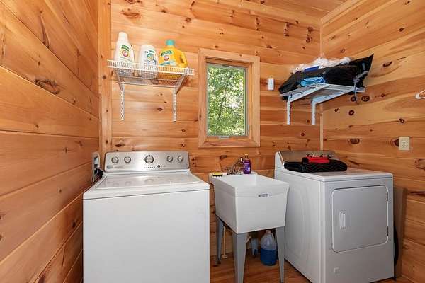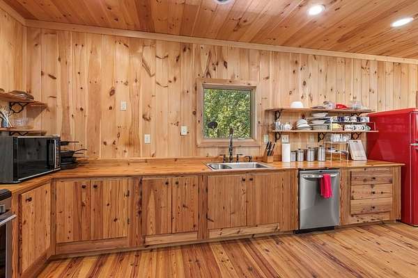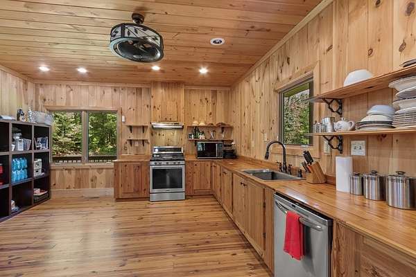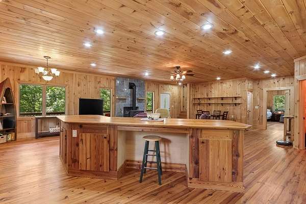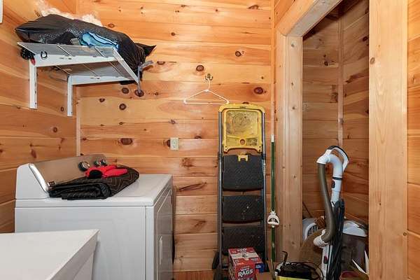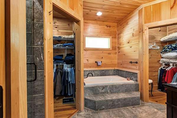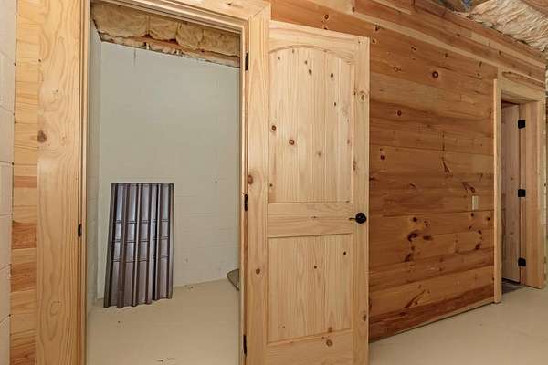 - Ceiling Fan(s), Insulation, Kitchen Island, Laundry On Main, Primary On Main, Smoke Detector, Tile Shower/Tub, Walk-In Closet(s), Washer/Dryer Connection, Wood Ceiling(s), Wood Walls