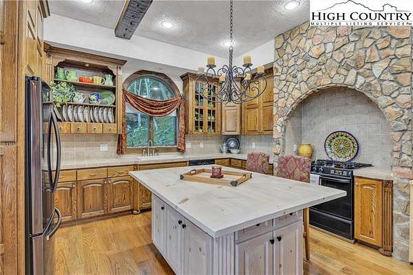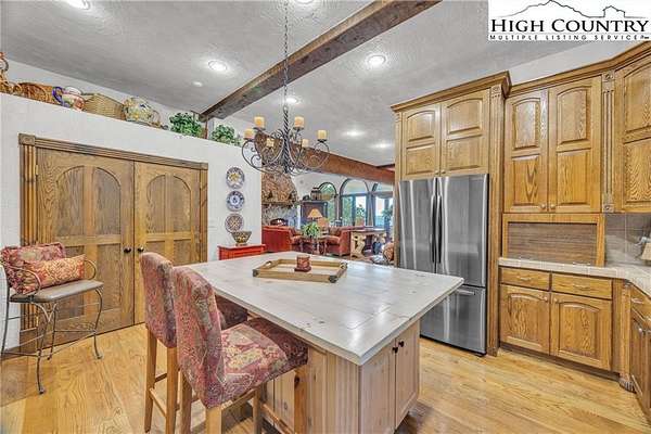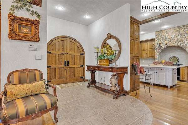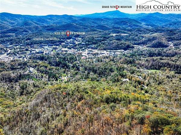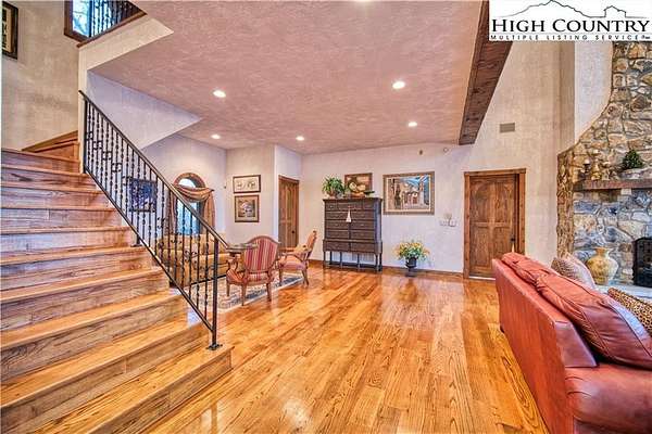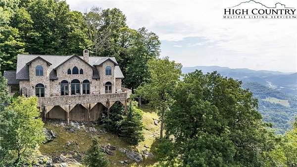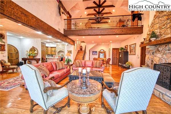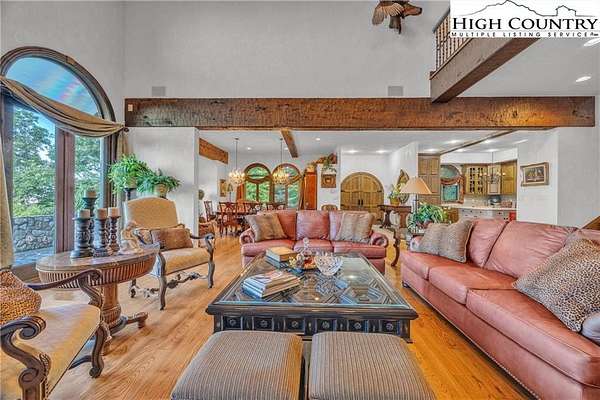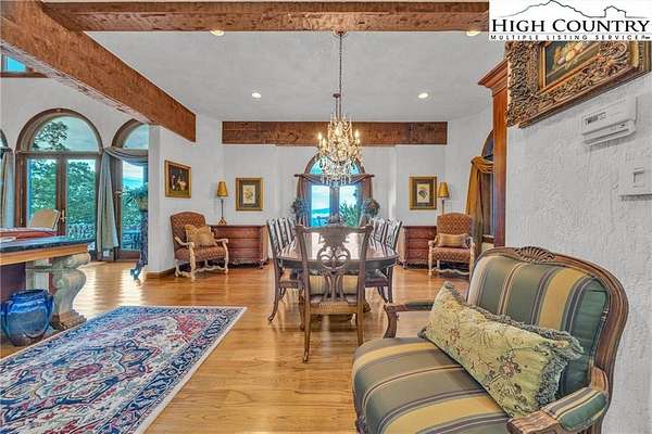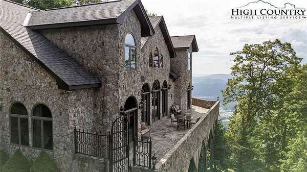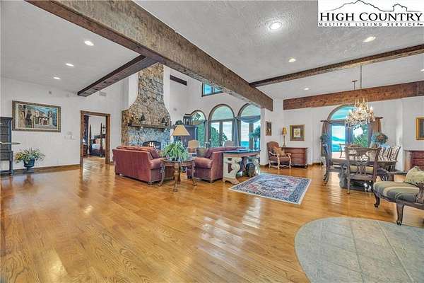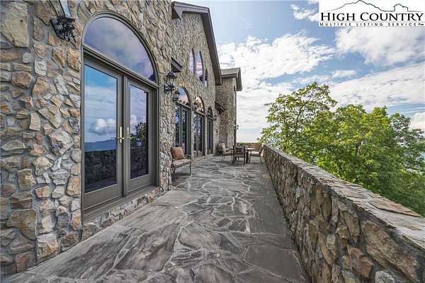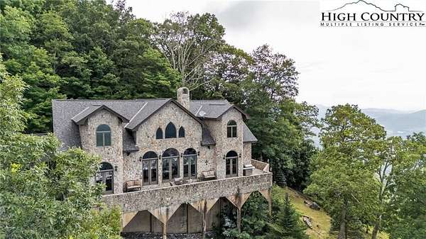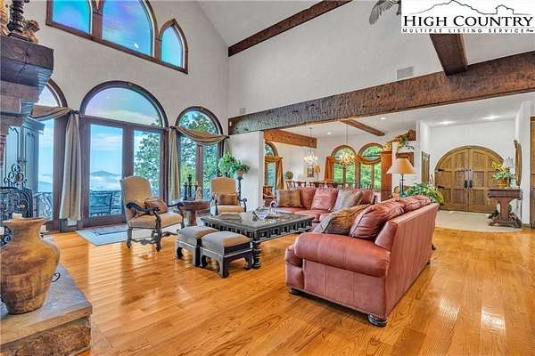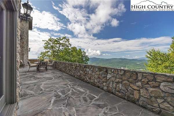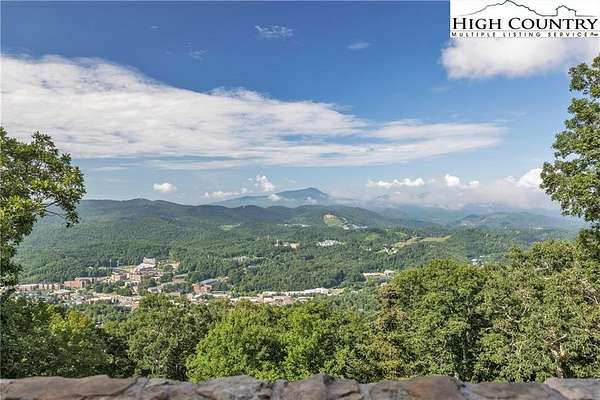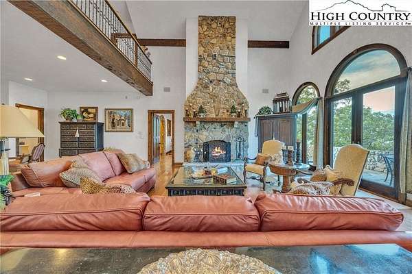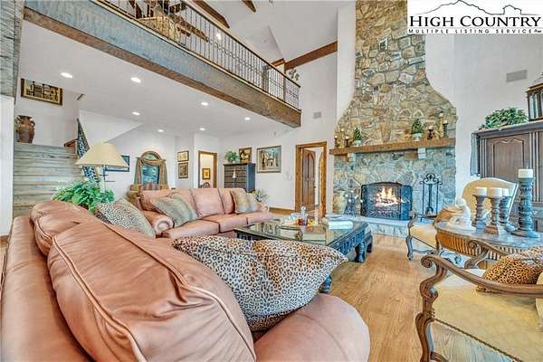 Set high above the heart of Boone, this distinctive mountain estate commands sweeping, multi-range Appalachian views overlooking the town and Appalachian State University below -- with the rare assurance of adjoining land permanently protected by Blue Ridge Conservancy, preserving both privacy and view corridors for generations to come. Approached by a private drive, the home immediately establishes a sense of arrival. A covered front porch offers a quiet place to take in the elevation and setting, while the rear of the home opens to a large stone patio designed for entertaining, dining, and soaking in the expansive mountain and town views beyond. Inside, the home is rich with character and craftsmanship. Wide-planked hardwood floors, framed beams, and vaulted ceilings create warmth and scale throughout. The expansive living area is anchored by a massive stone fireplace, serving as both a focal point and gathering space, with French doors that open directly to the stone patio and views beyond. A chef's kitchen flows seamlessly into the main living spaces, ideal for both everyday living and hosting. A formal dining area, also featuring French doors, connects indoor gatherings to the outdoor terrace, reinforcing the home's emphasis on lifestyle and connection to its setting.