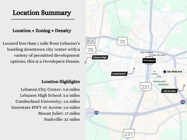 Adjacent to Vanderbilt's Wilson County Hospital McFarland campus, Cumberland U school of nursing and the TCAT campus. Just minutes from Lebanon High, the Wilson County fair grounds and HWY 40 interstate access. This is an intriguing Investor portfolio pick-up and Developer opportunity. Boundary survey available.