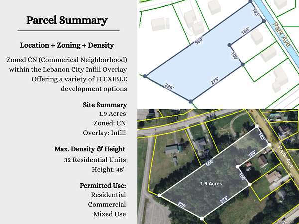 Located just blocks from Lebanon's bustling Town Square AND zoned CN (Commercial Neighborhood) within the city's Residential Infill Overlay District. Flexible CN zoning permits a wide range of development options, including Residential and Commercial Mixed Use. Max density permits up to 32 residential units.