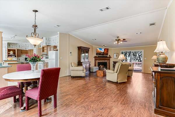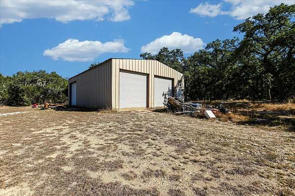 Nicely maintained manufactured home nestled among mature oak trees on 5.79 fully fenced acres. This inviting 3-bed, 2-bath home offers an open-concept layout with a spacious kitchen featuring a center island, gas range, built-in desk, and a sunny eat-in dining area. The living and formal dining rooms showcase peaceful views of the oaks and include a cozy wood-burning fireplace. Enjoy outdoor living on both the front and back decks. Additional features include a laundry room, a detached 2-car carport, and a large metal shop situated toward the back of the property-ideal for storage, hobbies, or workspace. The property also includes a small (currently dry) pond, hot tub on back deck, a fenced backyard, and a garden area. Experience quiet, scenic Hill Country living just minutes from town.