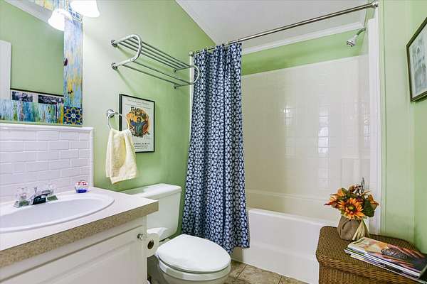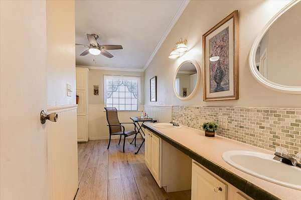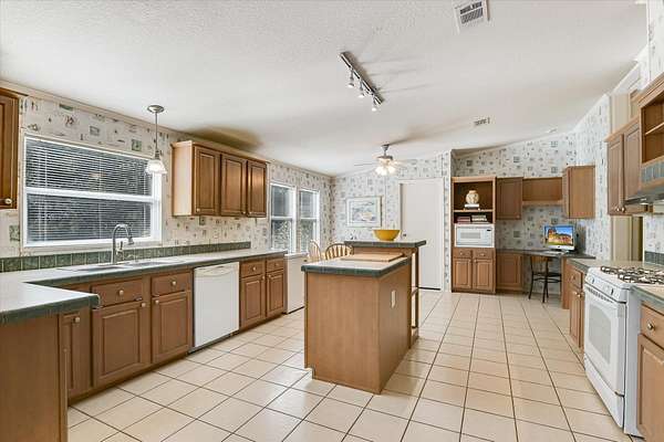 - Ceiling Fan(s), Eat-In Kitchen, Kitchen Island, Multiple Dining Areas, No Interior Steps, Open Floorplan, Primary Bedroom On Main, Tile Counters, Walk-In Closet(s)