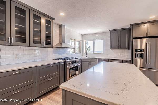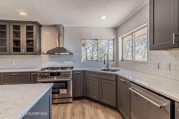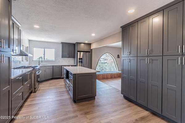 Striking sandstone features welcome you to this resort-like retreat in the Foothills. Nestled on five private acres, this home offers the best of both worlds with seclusion among nature while still being just minutes from Farmington amenities. With five bedrooms, four bathrooms, three spacious living areas, a two car garage, a private drive, and a dedicated workshop, there is room for everyone and every hobby.The owners have thoughtfully invested in extensive high quality upgrades throughout. Luxury French oak style vinyl flooring flows through the home, complemented by fresh interior paint and updated baseboards. The kitchen has been completely reimagined with semi custom American Woodmark cabinetry, quartz countertops, and top tier appliances including KitchenAid and a Thor six burner stove. Bathrooms feature glazed ceramic tile, modern fixtures, and stylish Saint Tropez toilets.Additional updates include new chimney blowers, Mediterranean style garage doors with glass panels, a newly added two car carport, and recent gravel work on the driveway. Outdoors, multiple sitting areas invite you to soak in the enchanting landscape whether for morning coffee or evening sunsets.This thoughtfully upgraded home combines modern luxury with the peace and privacy of its natural setting. It is an ideal retreat for both relaxation and entertaining. Do not miss the chance to make 5301 Rinconada Street your forever home.