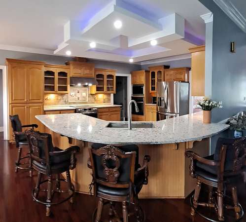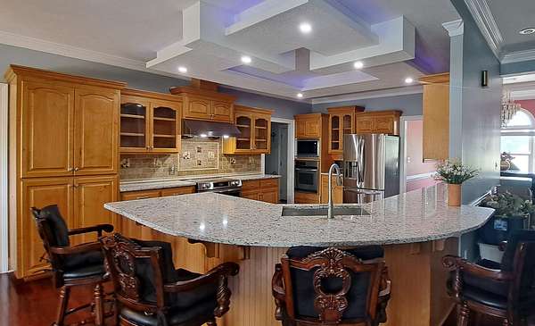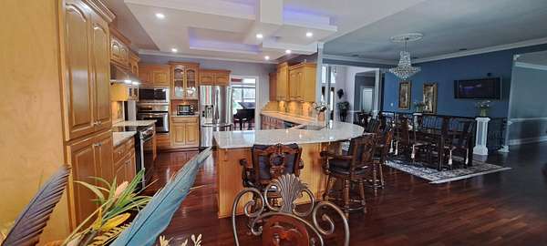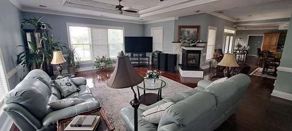 This waterfront home might have everything already! Beautiful 5 bedroom, 6 bath Mediterranean style with 3 acres on a lake. Enjoy fishing from your private dock and then cooling off in your salt water pool. Host that next party or Sunday football game in your own rec room with wet bar, (yes decor and billiard table stays). Enjoy the extra garage space for your hobby project of create your own personal fitness room. Other features include a central vacuum system, security system, safe room, work shop, lots of crown molding,, Brazilian Rose Wood flooring, open concept, wrap around driveway, 24x24 out building w/carport and much more. This home has many unique features awaiting your family's enjoyment. This home is located in a friendly neighborhood near shopping, restaurants, and the Fort.