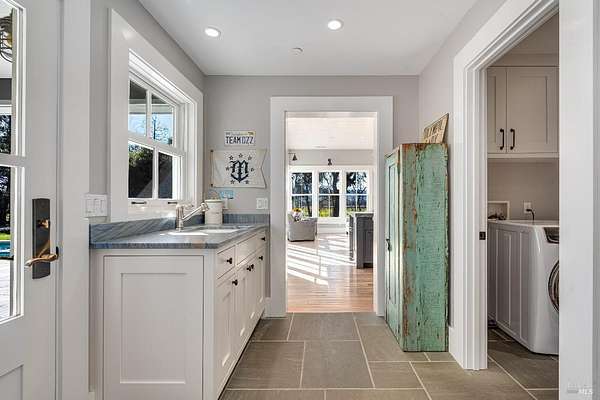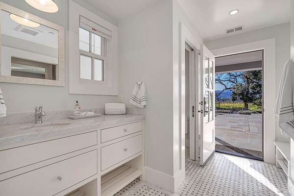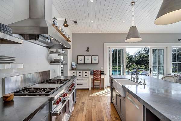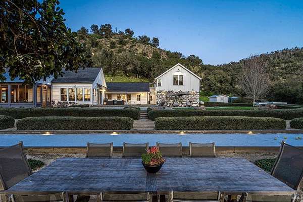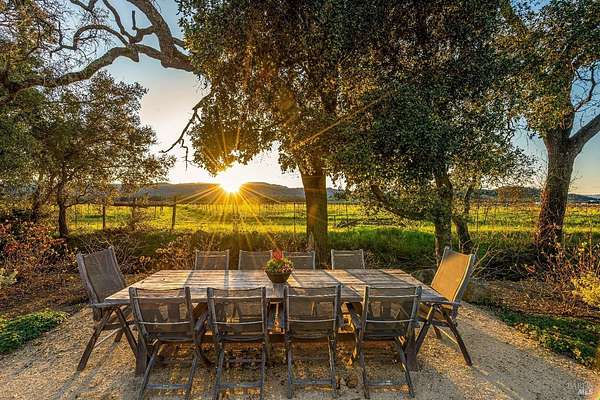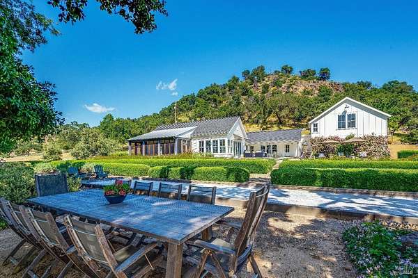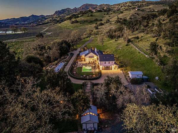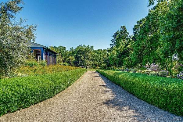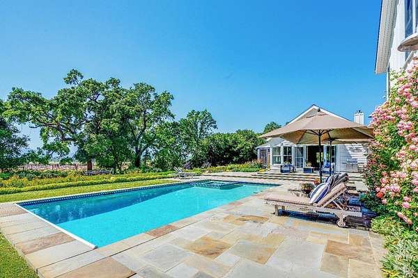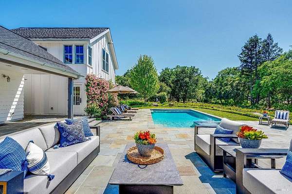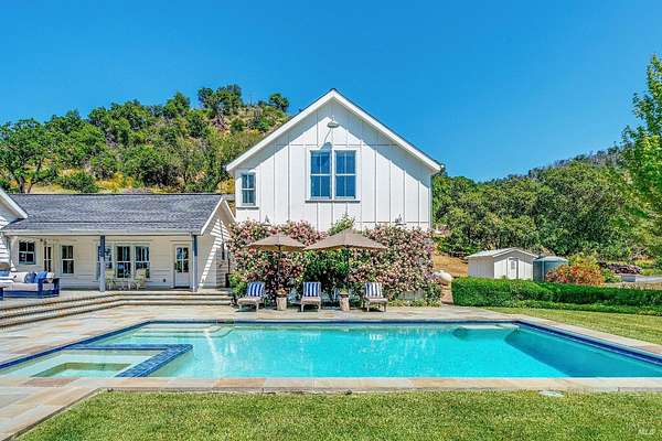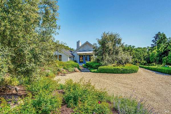 Nestled on 3.47 acres in the prestigious Stags Leap AVA, this prime country property blends timeless farmhouse charm with modern sophistication. Surrounded by renowned vineyards like Shafer and Chimney Rock, this serene estate is minutes from Yountville's world-class dining and Napa's conveniences, offering unmatched privacy and idyllic vineyard views. A thoughtfully designed open floor plan, warm walnut floors, reclaimed elements, Ashley Norton hardware, and custom millwork add understated luxury to the 4BR/4.5BA residence. The great room features soaring ceilings, a wood-burning fireplace, wall-to-wall built-ins, a wet bar, and massive Fleetwood doors opening to a year-round screened porch. A farmhouse-style kitchen with slate gray cabinetry, top-tier appliances, an expansive island, and a walk-in butler's pantry connects to a lounge and dining area with easy outdoor access. The primary suite, with garden views includes a luxurious Carrara marble bathroom and custom walk-in closet. Three additional en suite bedrooms, including a poolside suite, offer ample guest space. Outside, blue stone patios lead to exquisite gardens, a heated saltwater pool with spa, an expansive lawn, bocce court, and seasonal creek overlooking the vast neighboring vineyard.