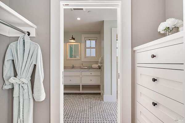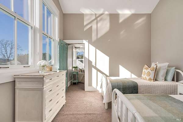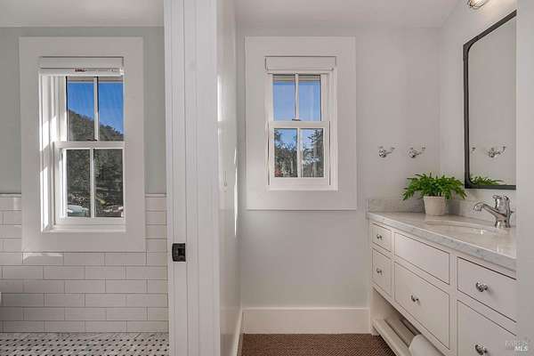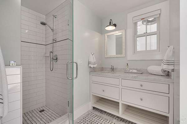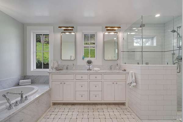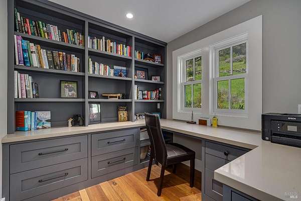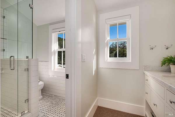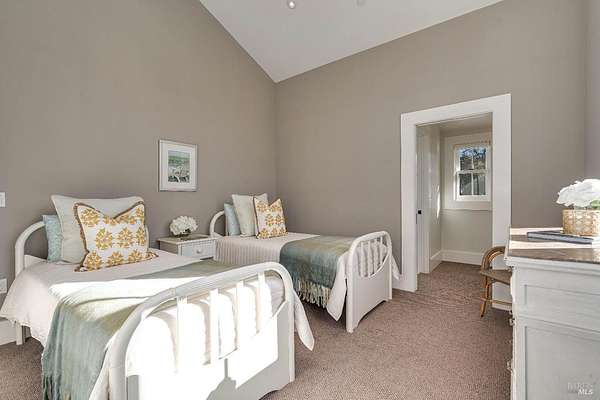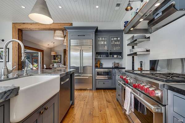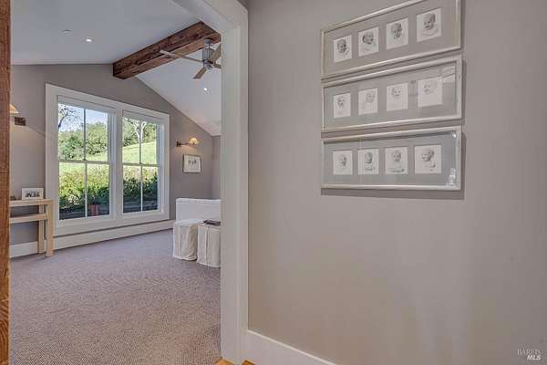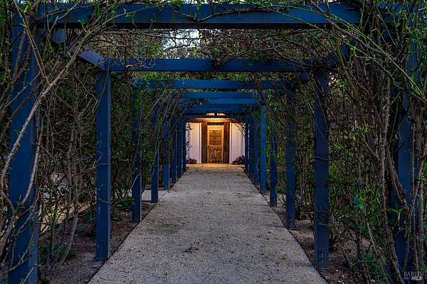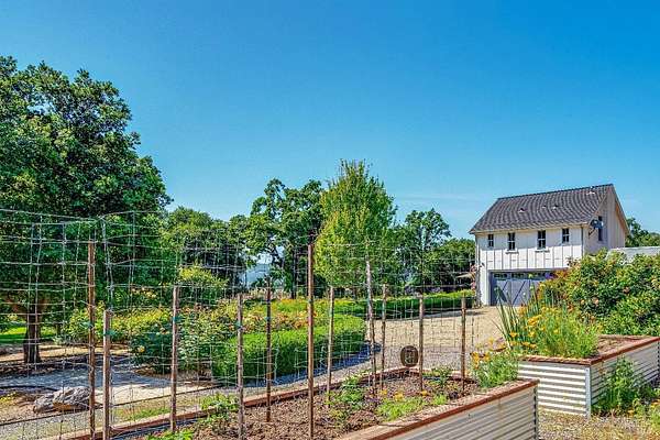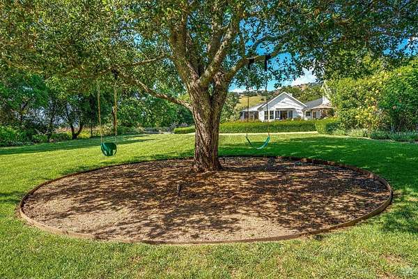Nestled on 3.47 acres in the prestigious Stags Leap AVA, this prime country property blends timeless farmhouse charm with modern sophistication. Surrounded by renowned vineyards like Shafer and Chimney Rock, this serene estate is minutes from Yountville's world-class dining and Napa's conveniences, offering unmatched privacy and idyllic vineyard views. A thoughtfully designed open floor plan, warm walnut floors, reclaimed elements, Ashley Norton hardware, and custom millwork add understated luxury to the 4BR/4.5BA residence. The great room features soaring ceilings, a wood-burning fireplace, wall-to-wall built-ins, a wet bar, and massive Fleetwood doors opening to a year-round screened porch. A farmhouse-style kitchen with slate gray cabinetry, top-tier appliances, an expansive island, and a walk-in butler's pantry connects to a lounge and dining area with easy outdoor access. The primary suite, with garden views includes a luxurious Carrara marble bathroom and custom walk-in closet. Three additional en suite bedrooms, including a poolside suite, offer ample guest space. Outside, blue stone patios lead to exquisite gardens, a heated saltwater pool with spa, an expansive lawn, bocce court, and seasonal creek overlooking the vast neighboring vineyard.