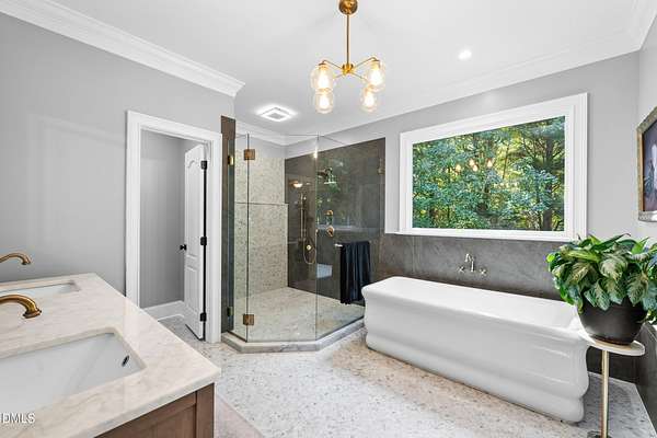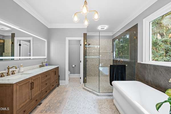 - Bathtub Only, Bathtub/Shower Combination, Bookcases, Built-In Features, Cedar Closet(s), Ceiling Fan(s), Chandelier, Crown Molding, Double Vanity, Eat-In Kitchen, Granite Counters, High Ceilings, High Speed Internet, Kitchen Island, Open Floorplan, Pantry, Primary Downstairs, Quartz Counters, Separate Shower, Shower Only, Smart Home, Smart Thermostat, Smooth Ceilings, Soaking Tub, Walk-In Closet(s), Walk-In Shower, Water Closet