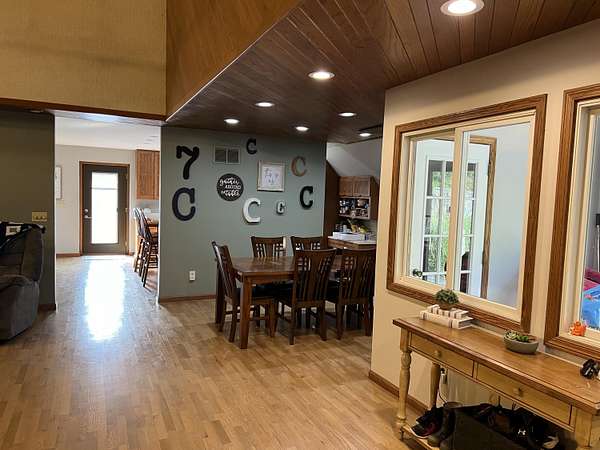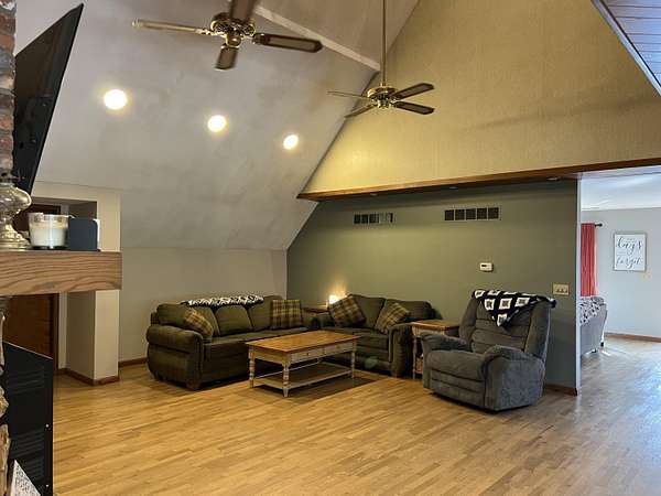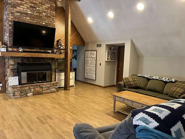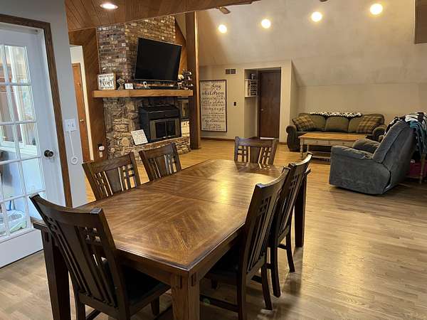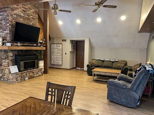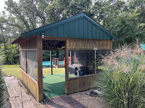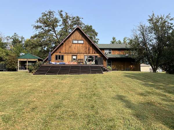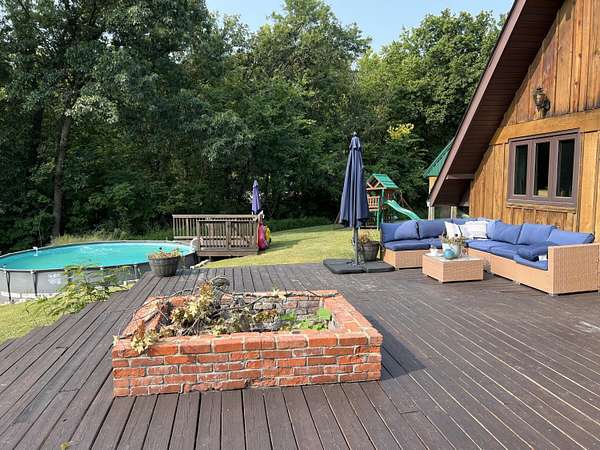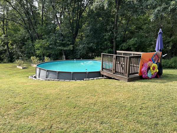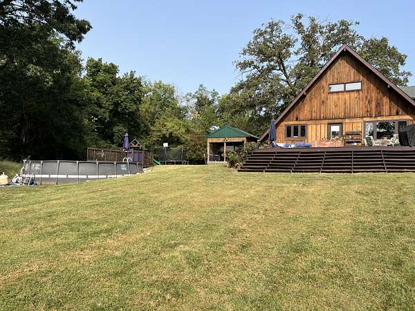 This custom built home has so much to offer. The almost 3 acres offers you privacy in the middle of town. The stained wood exterior with the large front porch is so inviting. The back yard offers a deck with a great view, above ground pool, playset and shelter house. The interior of the home has a spacious living room with a wood burning fireplace and beautiful hardwood floors(just recently refinished). The large kitchen attaches to a family room. Master bedroom has hardwood floors and 2 closets. The master bath has laundry area attached for convenience. The spacious bath has a soaker tub and a tile shower. Upstairs has 2 large bedrooms, loft area and bathroom. upstairs is heat by electric heat and window air. Central downstairs.