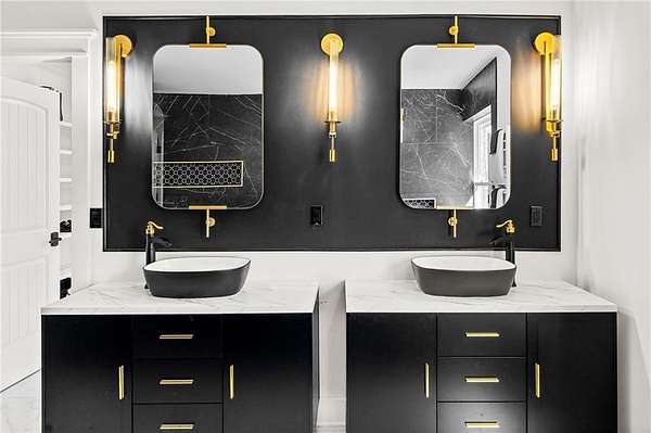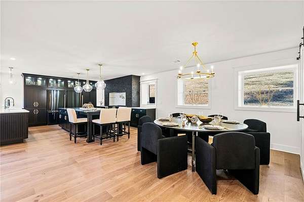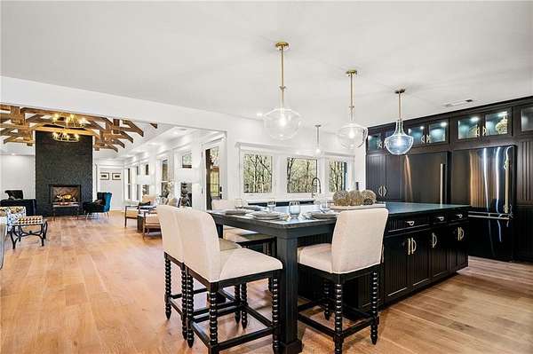 The black and champagne gold dream kitchen is a showstopper, complete with dual refrigerators, a 46" Hallman gas range, pristine white quartz countertops, and a stunning 10-foot leathered granite island with seating. Adjacent to the kitchen, the dining area is complemented by a walk-in pantry cleverly hidden behind a sliding door.