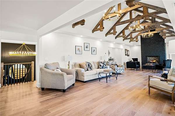 As you step into this beautiful home, you will be greeted by a vaulted grand room featuring handcrafted wood beams, a floor-to-ceiling modern stone gas log fireplace, and oversized windows that flood the space with soothing natural light.