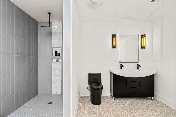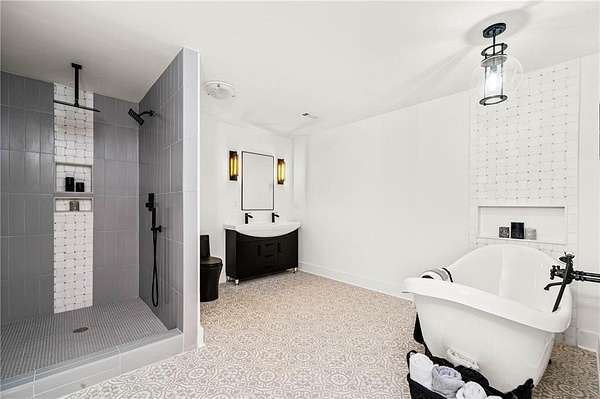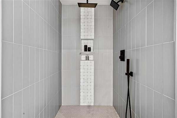 The primary suite on the main level offers a serene retreat with a tambour wall modern fireplace, peaceful views of the converging streams below, an oversized shower and soaking tub combination, dual vanities, and a custom solid wood walk-in closet. Two additional spacious bedrooms, including a secondary ensuite, a laundry room with matching custom cabinetry, and a powder room complete the main level. The terrace level is an entertainer's dream, featuring: