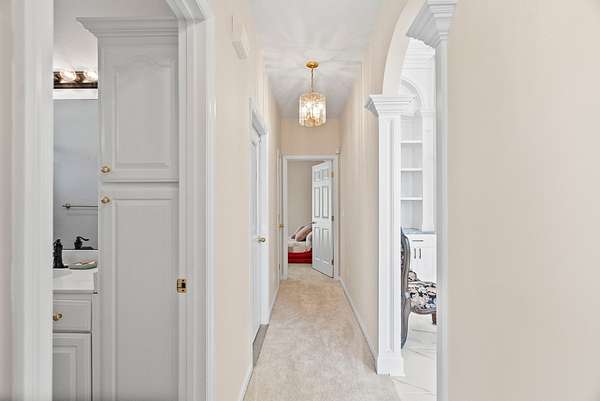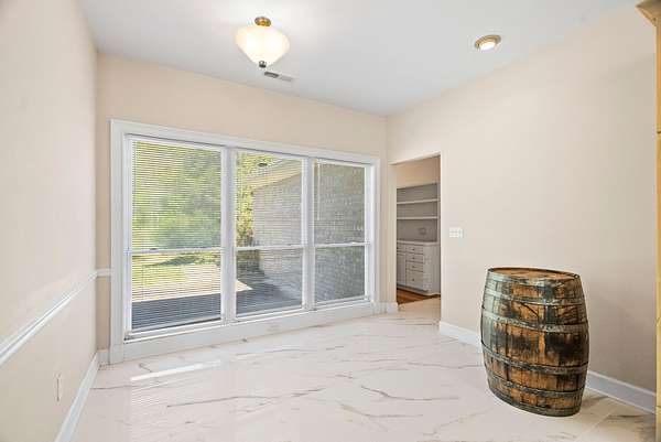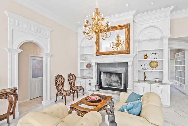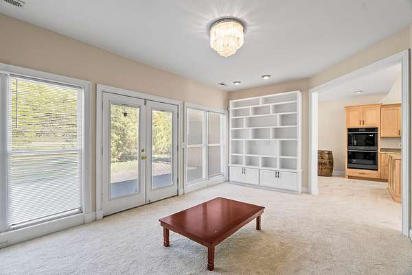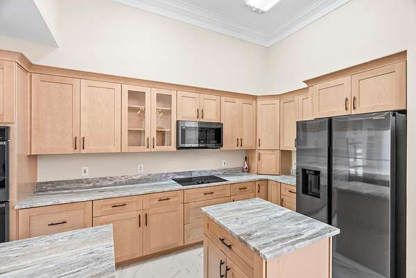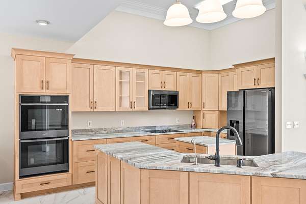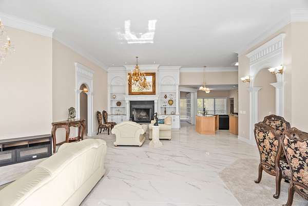 The main residence is a masterpiece of single-level living, designed with an open, flowing floor plan that invites both relaxation and entertainment. Every detail has been curated for comfort and style, from the intricate, hand-carved details adorning the custom built-ins and fireplace surround, bright Florida room to the stunningly remodeled kitchen. Here, culinary inspiration comes easy with rich granite countertops, brand-new cabinetry, and a full suite of modern black stainless appliances.