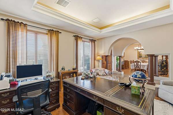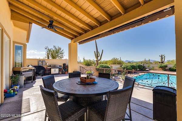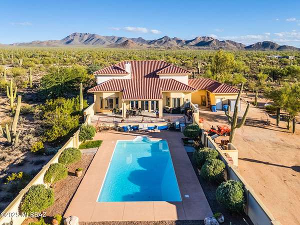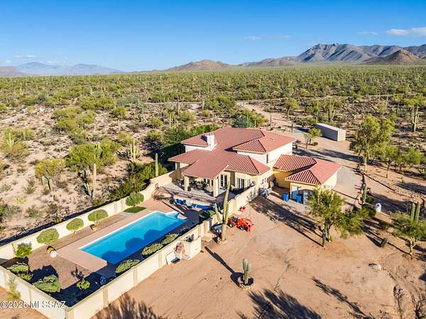 This stunning 3,844 sq. ft. estate, set on over 4 acres of Sonoran Desert, offers breathtaking views of the mountains, sunrises, and sunsets. With 4 bedrooms, 4 bathrooms, and a spacious layout with formal dining area, office space, loft and breakfast area, this home blends timeless design with modern comfort. Automatic blinds in the living room, abundant natural light, and a gourmet kitchen enhance the living space. Outside, an expansive patio with a retractable shade and LED lighting, plus a sparkling pool with a new pump, create a perfect desert retreat. A new downstairs HVAC system and solar panels provide energy efficiency. This home offers the best of luxury desert living.
