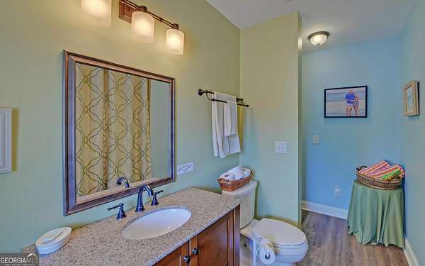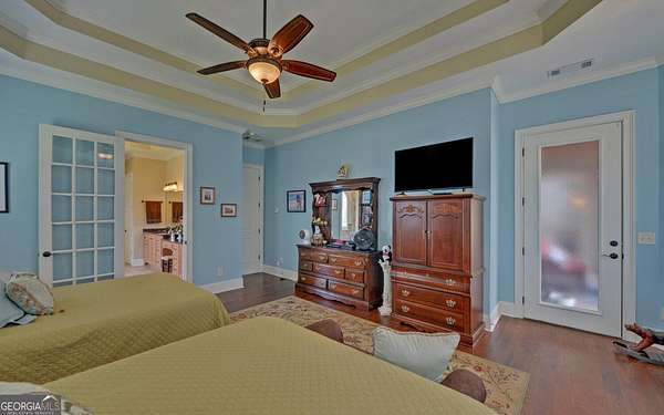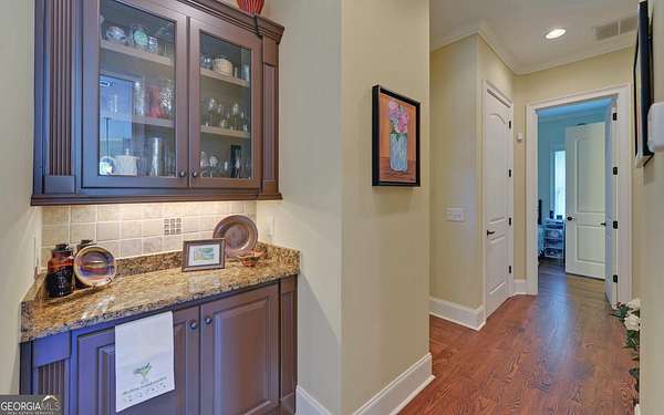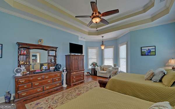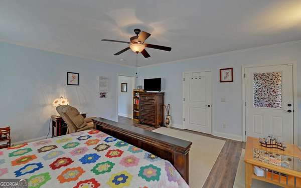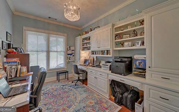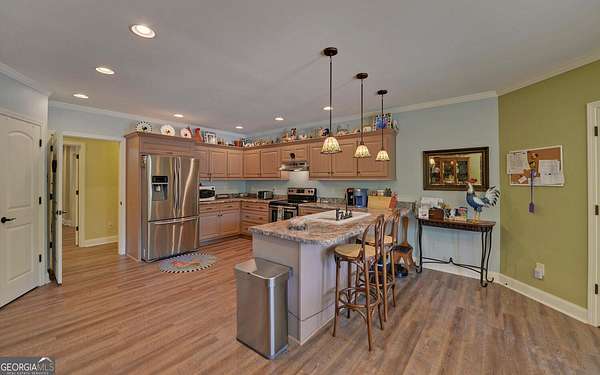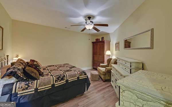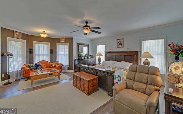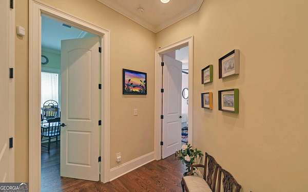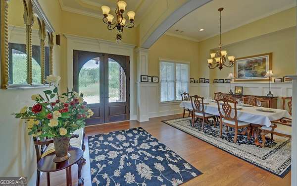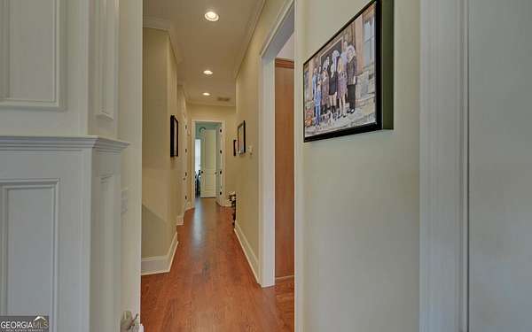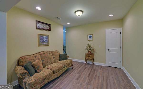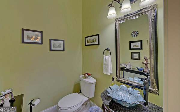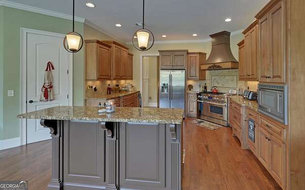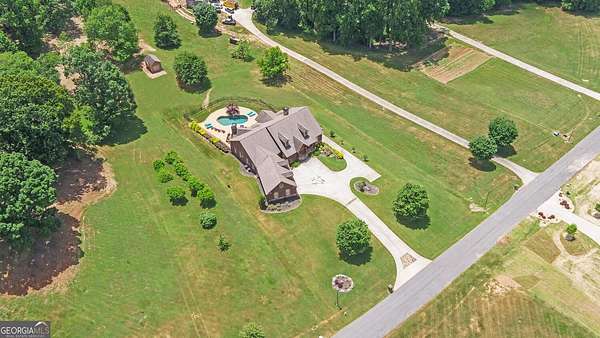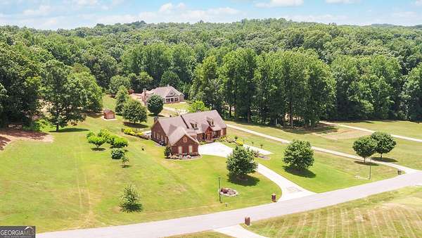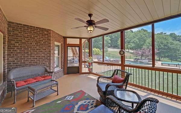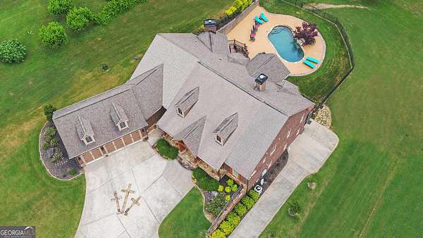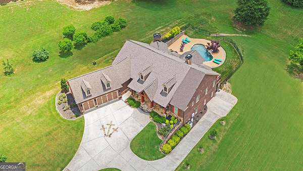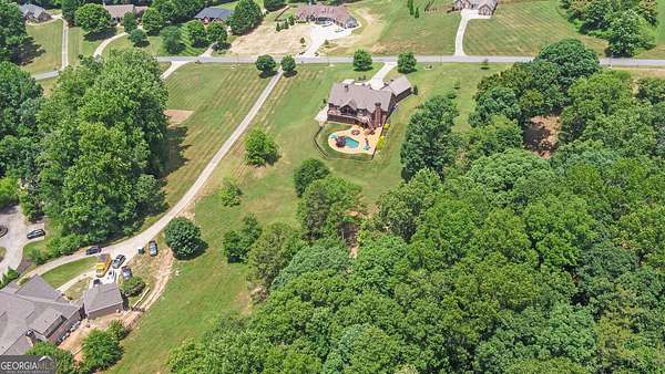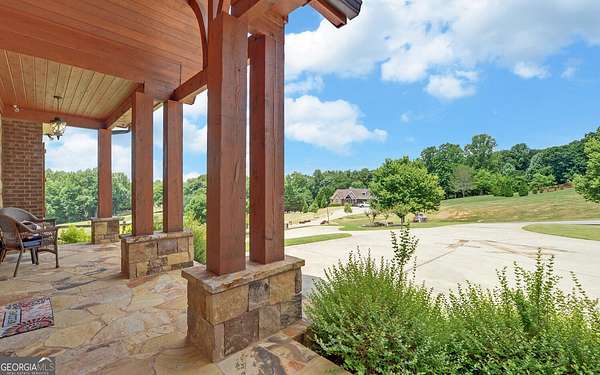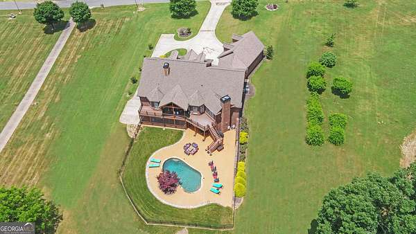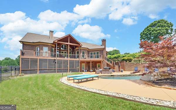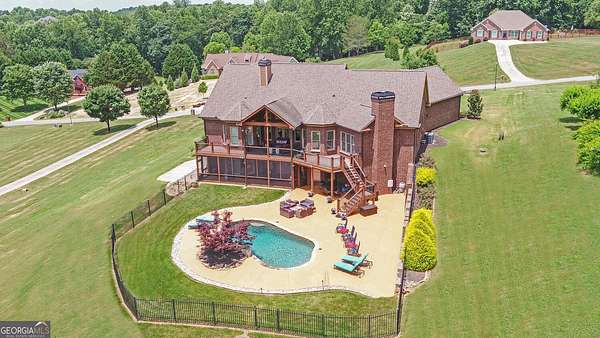 Luxury 4-sided brick estate on 2.3 private acres in sought-after Mount Vernon Preserve and the North Hall School District. This meticulously maintained home offers estate-sized living with a saltwater Gunite pool featuring a waterfall, expansive covered and screened composite decks, and wood-accented gables that showcase the rear elevation beautifully. The inviting rock front porch opens to a grand foyer with soaring vaulted ceilings extending through to the covered back porch. The thoughtfully designed split-bedroom floorplan includes a formal dining room, a keeping room with wood-accented ceilings and fireplace, a formal living room with detailed trim and a second fireplace. The chef's kitchen features a dual-fuel range, abundant cabinetry, large pantry, and an adjoining eat-in area. The spacious primary suite offers a sitting area with private deck access, dual vanities, separate tub and shower, and tile flooring. Two secondary bedrooms share a Jack-and-Jill bath, and a dedicated office with built-ins provides excellent workspace. The terrace level is ideal for multi-generational living or entertaining, offering a full kitchen, private bedroom suite, flex space, workout room, pool-access bath, and separate exterior entrance. Outdoor living is exceptional with covered and screened patios, composite decking, and a beautifully landscaped Bermuda lawn. Additional features include a security camera system and extensive storage. Estate-sized lots and limited traffic provide privacy and tranquility in one of North Hall's most desirable communities. The back porch has brand new Composite decking and is ready for you to enjoy.