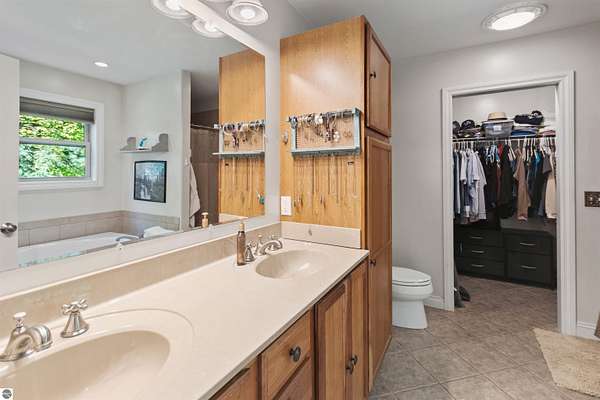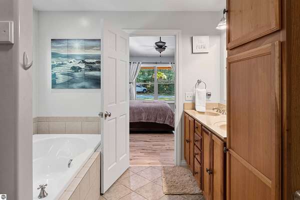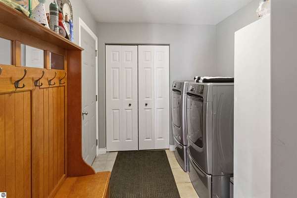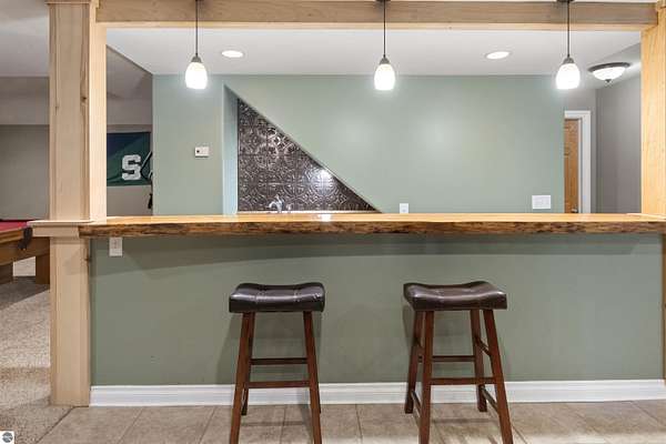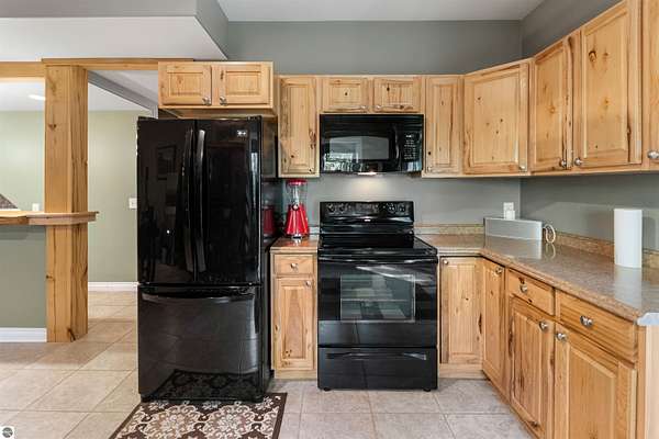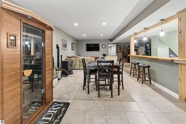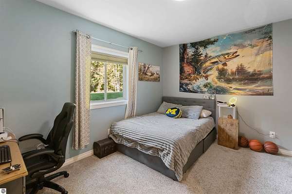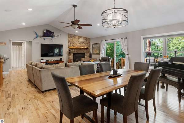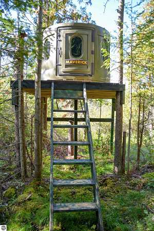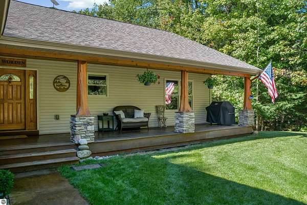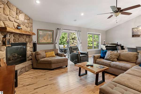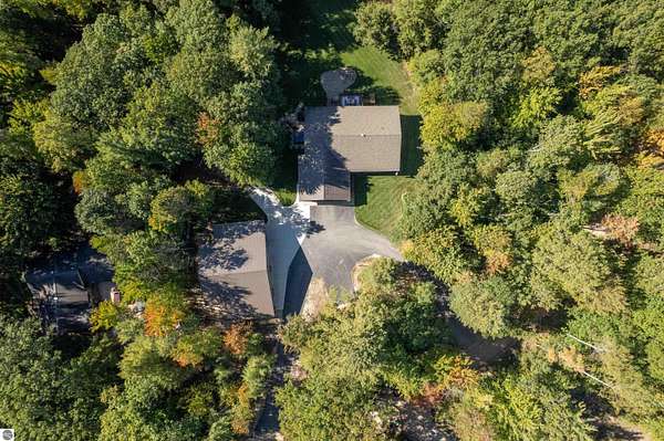 A true Northern Michigan experience awaits! Discover this impeccably maintained 6.9 acre ranch home, nestled in a tranquil neighborhood away from the hustle and bustle. The property's prime location borders vast stretches of state forest land, offering thousands of acres of trails perfect for hunting and outdoor recreation with a strategically placed hunting blind already installed. A substantial 4-door pole barn provides ample storage space, the secluded setting ensures complete privacy, and the friendly neighborhood and abundant wildlife create an ideal living environment. Children will delight in the charming tree fort, which doubles as a wildlife observation point, and pets can roam safely within the underground dog fence perimeter. The main level of the home showcases a luxurious master suite featuring an en suite bathroom with soaking tub & spacious walk-in closet. The open-concept kitchen flows seamlessly into the living room, which opens onto a beautiful west-facing deck overlooking the expansive backyard. Modern appliances complement the space, while main floor laundry adds convenience. Elegant hickory floors run throughout, and a cozy fireplace serves as a focal point. This level also includes a full bathroom and three additional bedrooms. The finished lower level boasts a fifth bedroom, pellet stove, versatile bonus room, 3/4 bath, and a kitchenette with wet bar that leads to a stone patio featuring a relaxing hot tub. Conveniently located just 1 mile from Westwoods Elementary School, 2 miles from Long Lake, and within a short drive to downtown Traverse City & numerous inland lakes, this home offers endless opportunities for year-round outdoor recreation and entertainment.