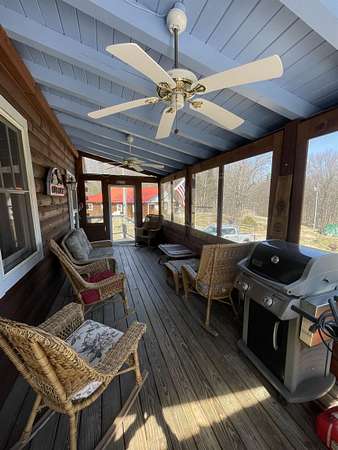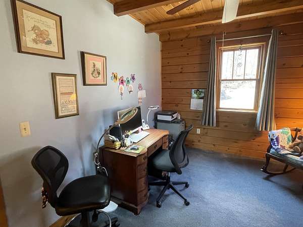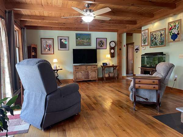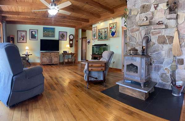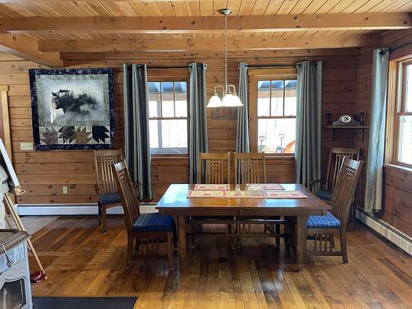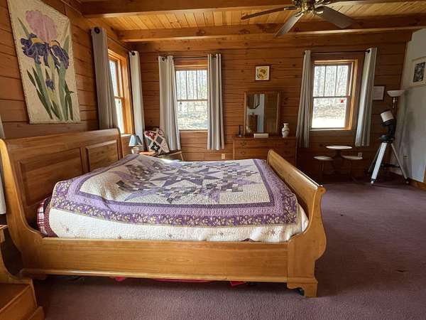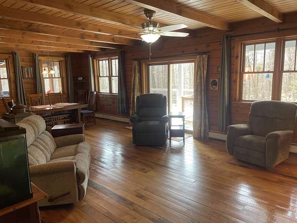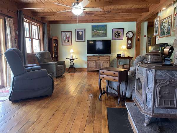 Coming soon. Delayed Showings, Showings starting Saturday the 18th 9 AM Welcome to your own private oasis. This exceptional log cabin is set on 6.9 peaceful acres and offers the perfect opportunity for a full time residence or a stunning getaway retreat. Located in the charming town of Stoddard, the property provides year round enjoyment with access to a town beach and boat ramp for summer fun, nearby snowmobiling trails, and close proximity to ski mountains for winter recreation. The home is in excellent condition and is accompanied by a large barn with an oversized carport. This versatile space can easily serve as a full garage, workshop, horse barn, or accommodate other animals or hobbies. Inside, the beautiful kitchen features custom cabinetry crafted from curly maple lumber harvested directly from the property. A Rev A Shelf organization system ensures easy access and functionality, and all appliances are included. Additional highlights include an expanded deck with covered carport and wood storage below, a fully fenced dog friendly backyard, and a charming screened farmer’s porch. The porch is equipped with removable plexiglass panels, allowing for comfortable use during the winter months. For added convenience, the home also features a wood waiter elevator running from the basement to the first floor, making it effortless to transport firewood for cozy evenings by the fire.
