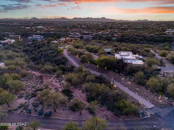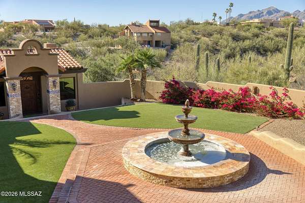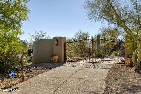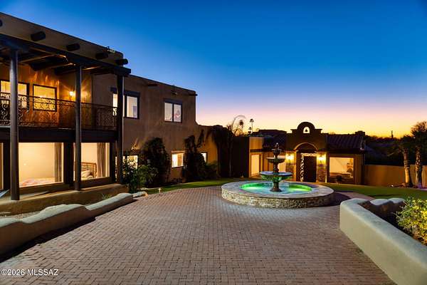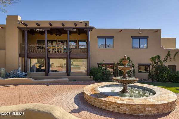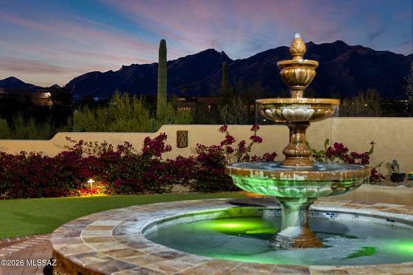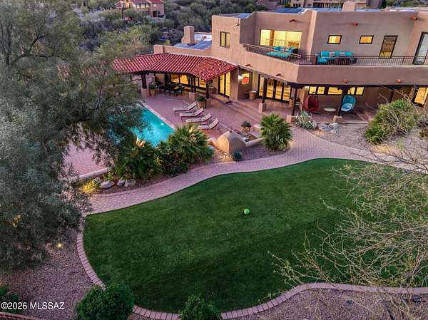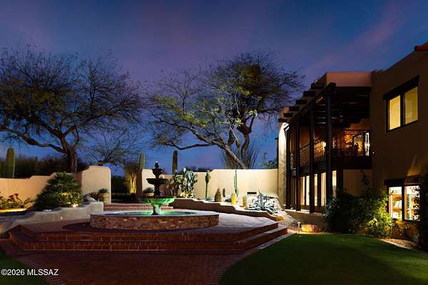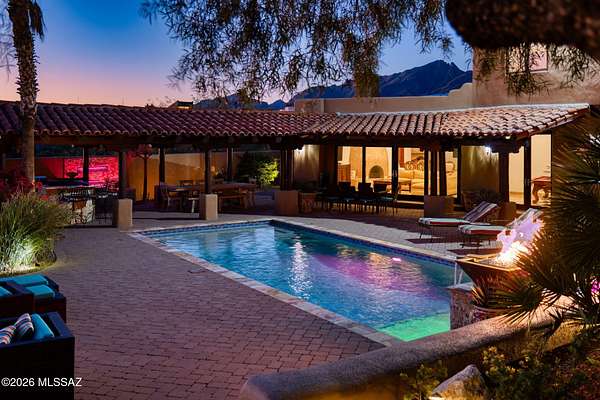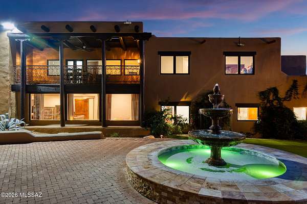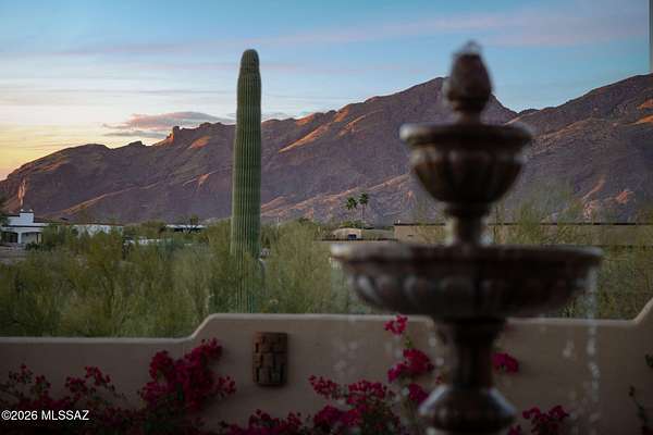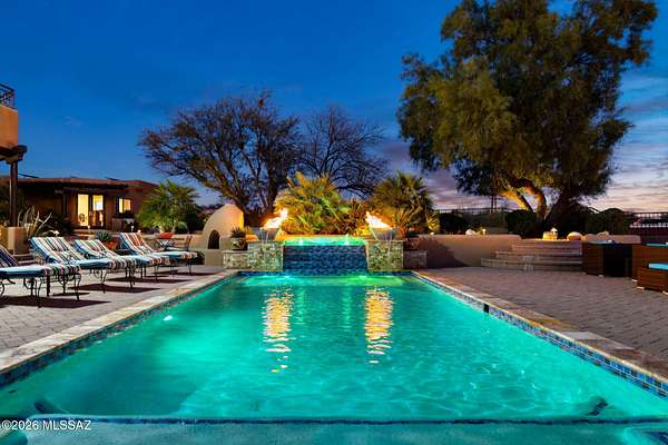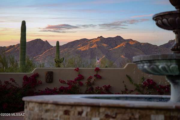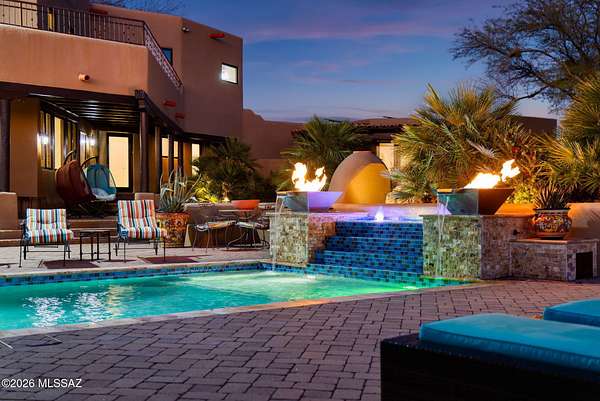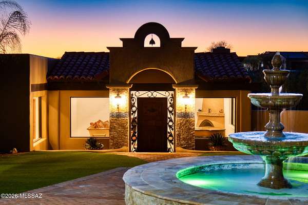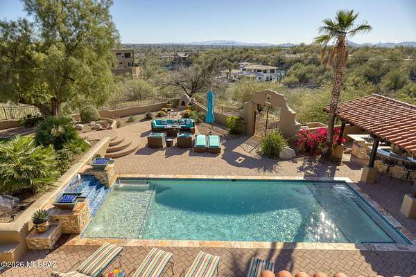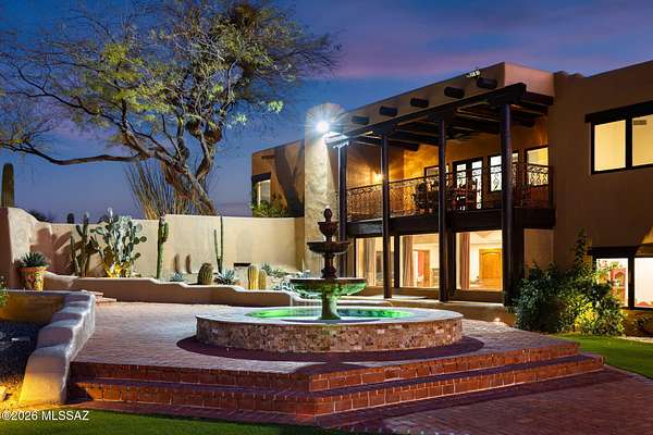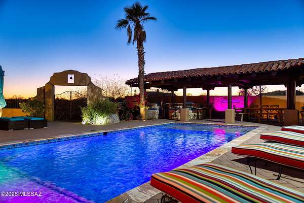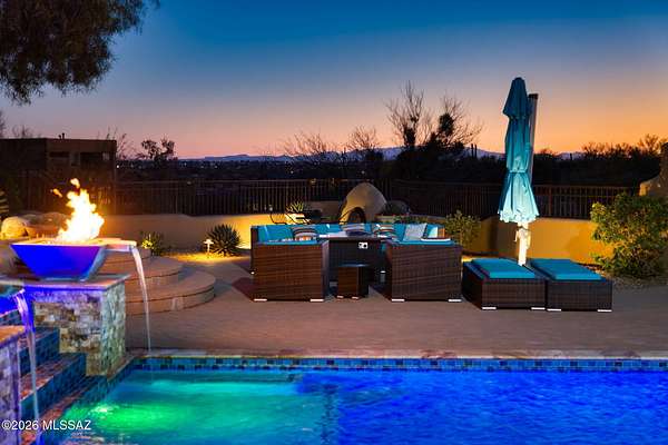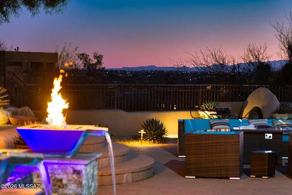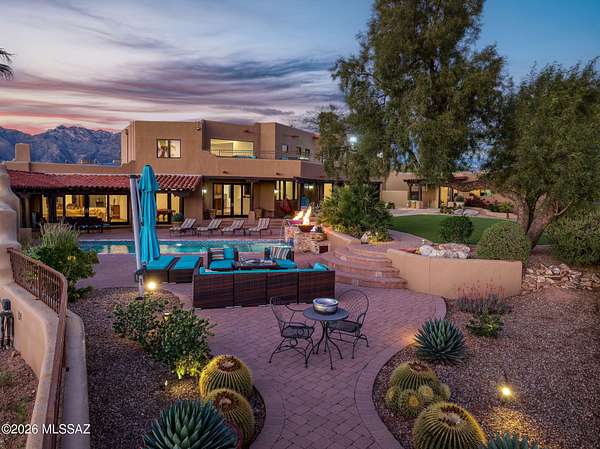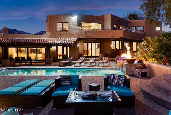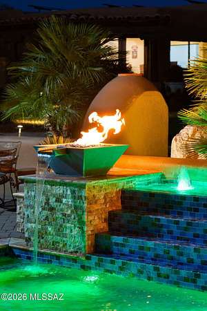 Own the ultimate private sanctuary in Tucson. This stunning 6,048 sq ft estate on 3 acres with NO HOA offers unmatched privacy and sweeping mountain and city-light views. The resort-style backyard features a dramatic stepped-tile fire waterfall pool, where flames dance above cascading water. Inside, soaring wood ceilings and six fireplaces create warmth and grandeur. The chef's kitchen boasts a Viking 6-burner range, Sub-Zero refrigeration, and dual ovens. The spacious main-level owner's suite opens to a wrap-around deck with breathtaking sunsets. Enjoy a true outdoor retreat with a full kitchen, massive ramada, lush lawn, and 4-car garage/workshop plus flex studio--perfect for a gym or creative space. A rare blend of luxury, privacy, and freedom.