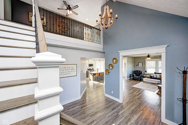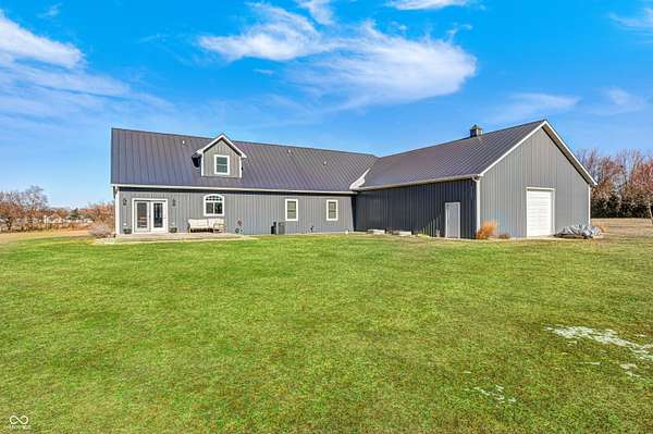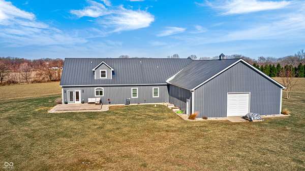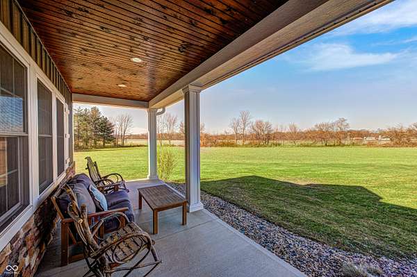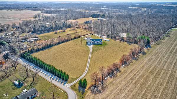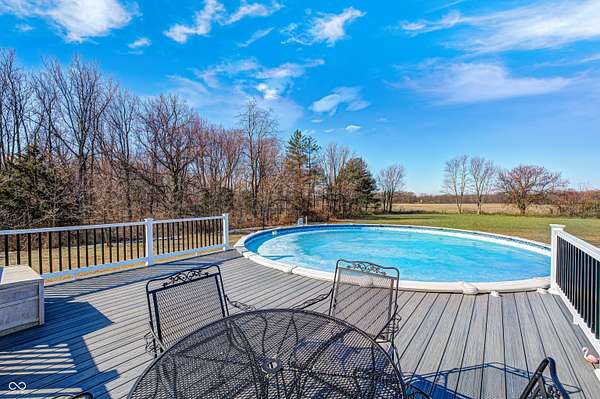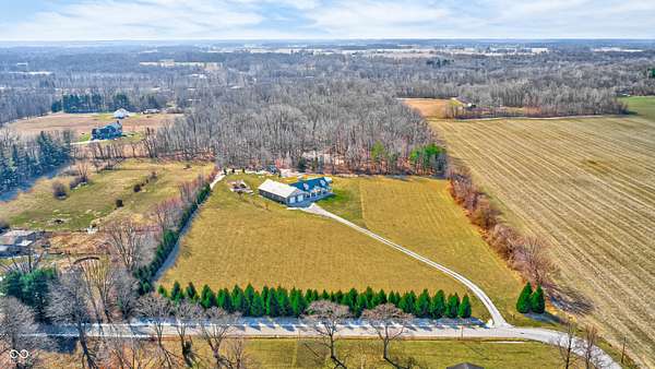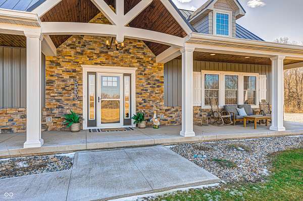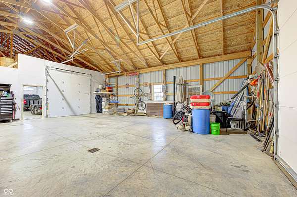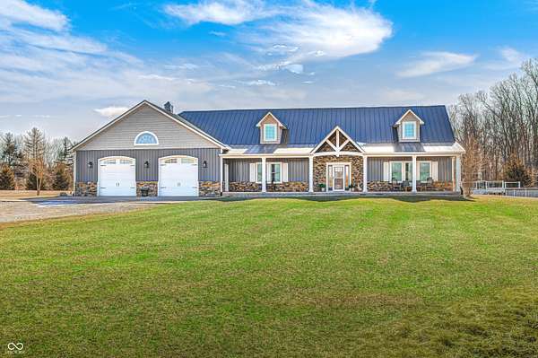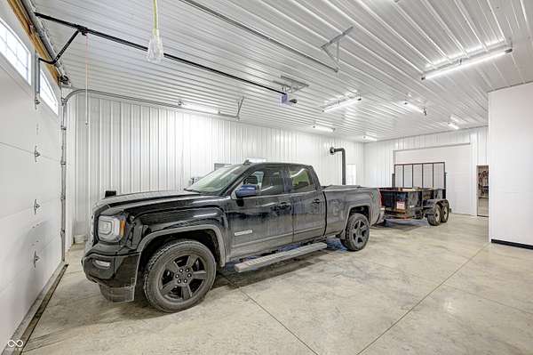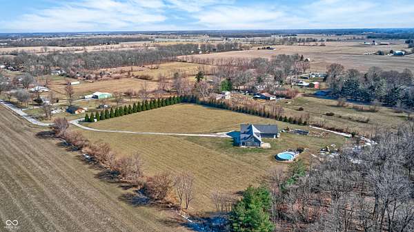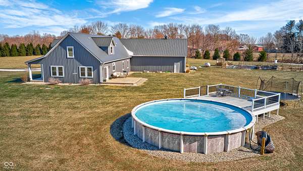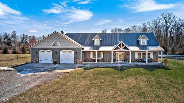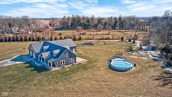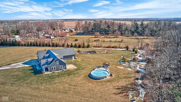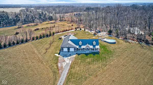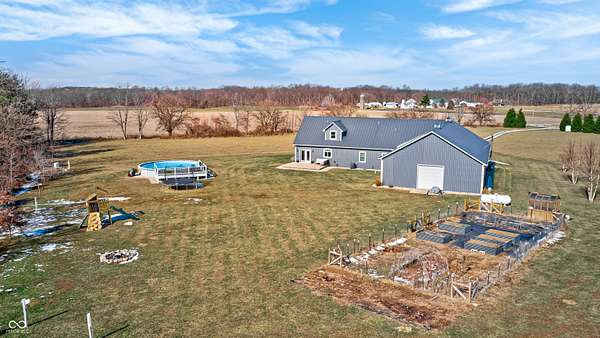 THIS IS IT! The perfect home you have been waiting for! Welcome to your beautifully maintained custom home, sitting on 8.5 acres, in Pendleton School district! This immaculate home, built in 2017, combines quality construction (2x6 walls, triple pane windows), thoughtful details, spacious living, a peaceful setting, and every man's dream with the massive garage/pole barn! Step inside the large foyer with natural light & 2 story ceilings. The inviting Great room is anchored by a cozy, corner FP and opens into the spacious well-appointed Kitchen. This breathtaking Kitchen/Dining Room combo offers coffered ceilings, a large center island w/breakfast bar, quartz counters, new appliances, custom shaker cabinets w/soft close drawers, farmhouse sink and a large walk-in pantry. Retreat to the main level Primary Suite which boasts a large WIC and a gorgeous en suite bath w/a walk-in tile shower, double sinks, & garden tub. Upstairs you will enjoy large bedrooms w/large closets, a full bath, and a spacious loft. The massive 40x80 (3,200 sf) attached garage/pole barn is about 1/2 insulated and offers a wood burning stove, plus a 16x18 finished gym space. Enjoy serenity and country living with 8.5 acres (1.5 in woods), a greenhouse, raised garden beds, chicken coop, above ground pool, and playset (all stay). Imagine sitting on the covered front porch and enjoying the Indiana sunsets! Don't miss this one and experience all this exceptional property has to offer!