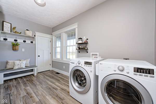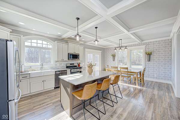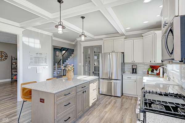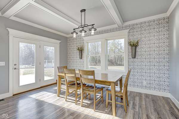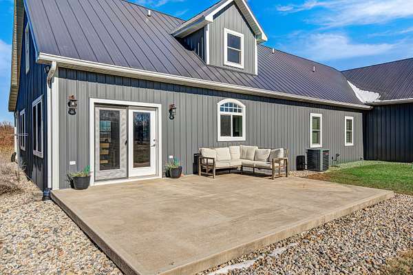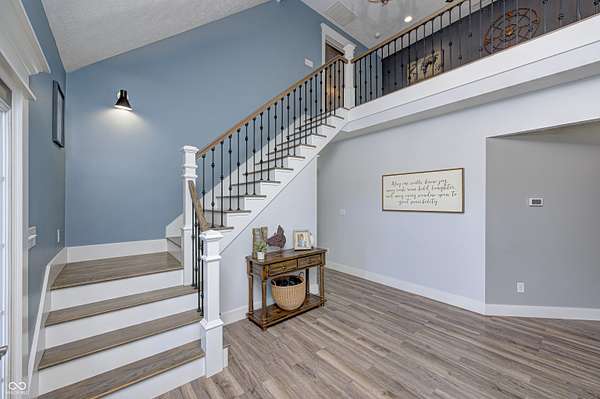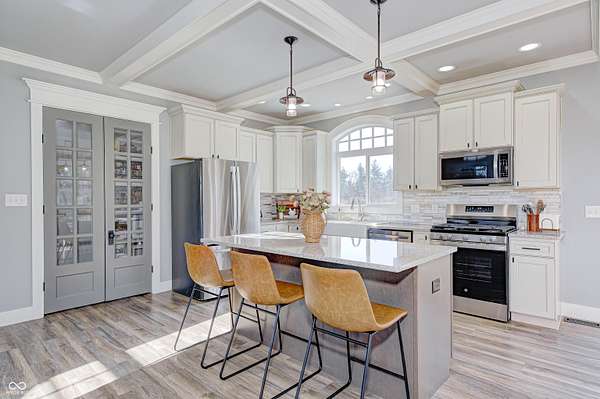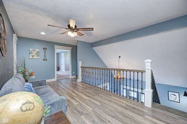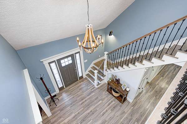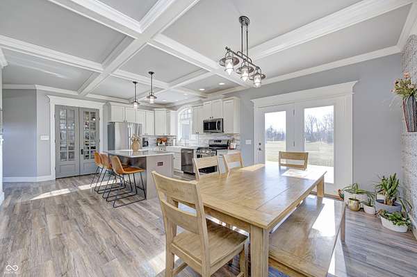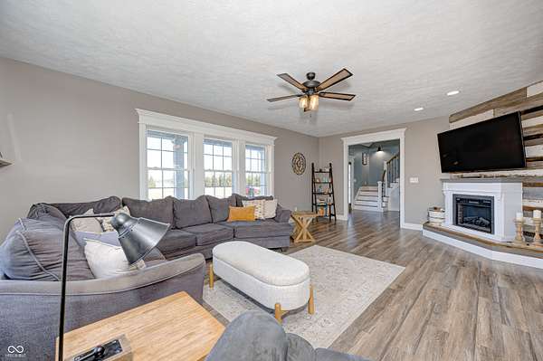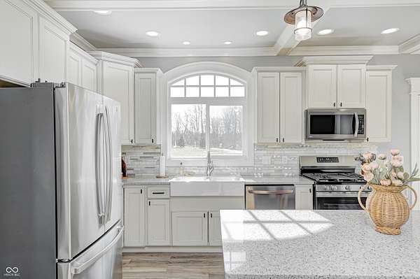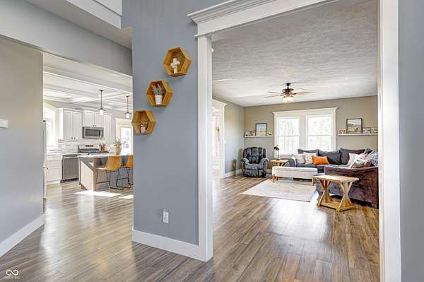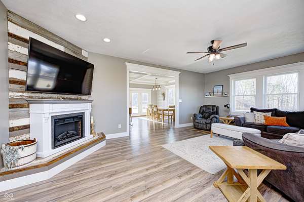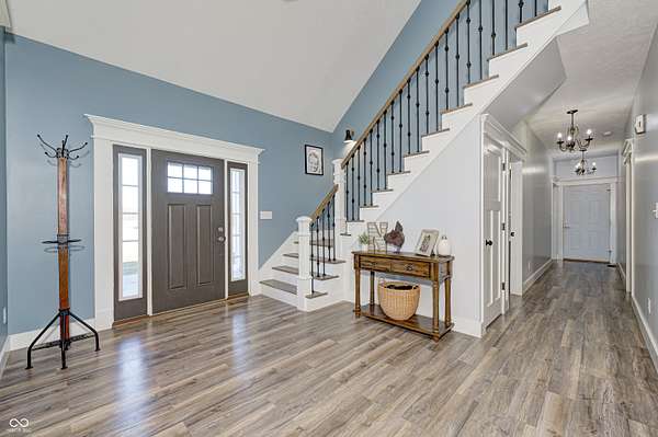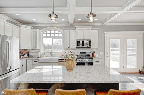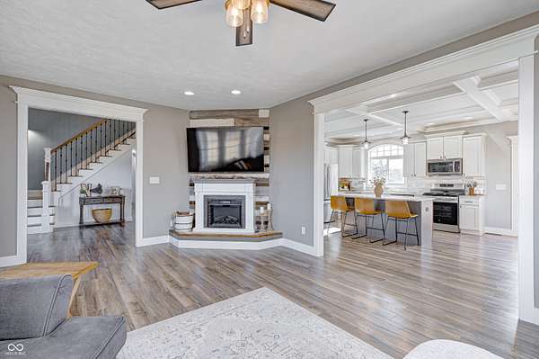 THIS IS IT! The perfect home you have been waiting for! Welcome to your beautifully maintained custom home, sitting on 8.5 acres, in Pendleton School district! This immaculate home, built in 2017, combines quality construction (2x6 walls, triple pane windows), thoughtful details, spacious living, a peaceful setting, and every man's dream with the massive garage/pole barn! Step inside the large foyer with natural light & 2 story ceilings. The inviting Great room is anchored by a cozy, corner FP and opens into the spacious well-appointed Kitchen. This breathtaking Kitchen/Dining Room combo offers coffered ceilings, a large center island w/breakfast bar, quartz counters, new appliances, custom shaker cabinets w/soft close drawers, farmhouse sink and a large walk-in pantry. Retreat to the main level Primary Suite which boasts a large WIC and a gorgeous en suite bath w/a walk-in tile shower, double sinks, & garden tub. Upstairs you will enjoy large bedrooms w/large closets, a full bath, and a spacious loft. The massive 40x80 (3,200 sf) attached garage/pole barn is about 1/2 insulated and offers a wood burning stove, plus a 16x18 finished gym space. Enjoy serenity and country living with 8.5 acres (1.5 in woods), a greenhouse, raised garden beds, chicken coop, above ground pool, and playset (all stay). Imagine sitting on the covered front porch and enjoying the Indiana sunsets! Don't miss this one and experience all this exceptional property has to offer!