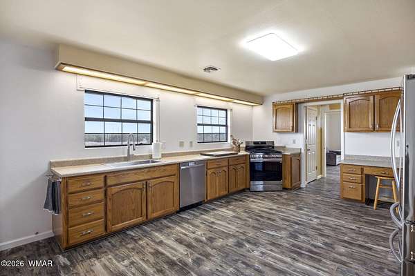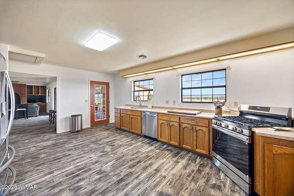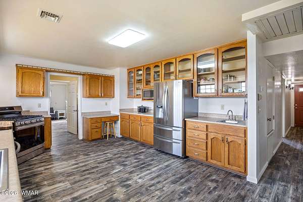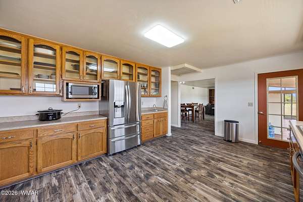 Privately situated on a gated 40-acres, this newly updated horse property features 3 Bedrooms and 2 Baths, a private drive, a pond, oversized garage, conex-box, multiple out buildings and a oversized detached shop. Enjoy an efficient, eco-friendly lifestyle with owned solar, a wind mill, private well, and modernize amenities including new flooring, new textured walls, new appliances, new farm sink, and a new large utility sink. The spacious flex room offers endless options--studio, office, or additional living space. This listing is two parcels 403-59-011B and 403-59-011A Beautifully maintained!