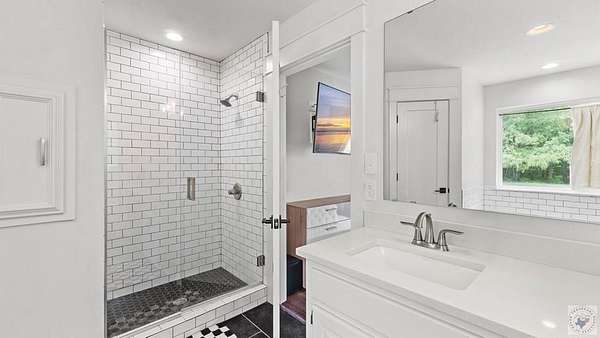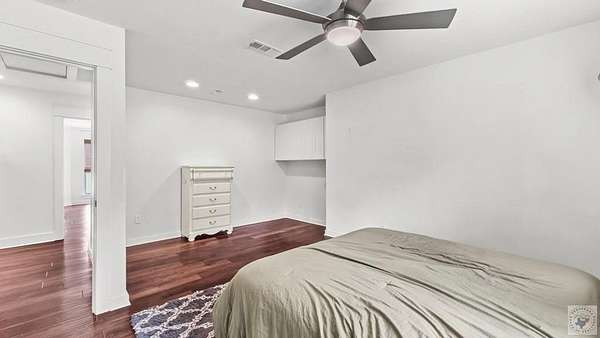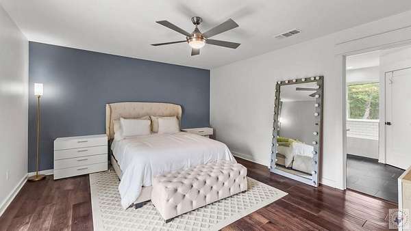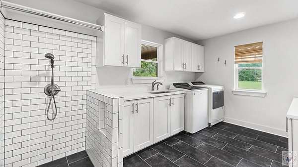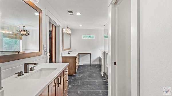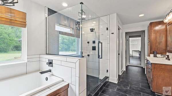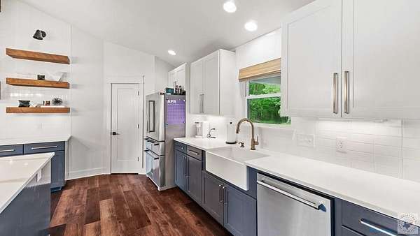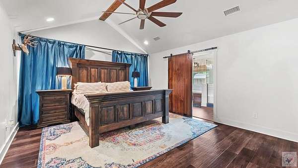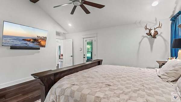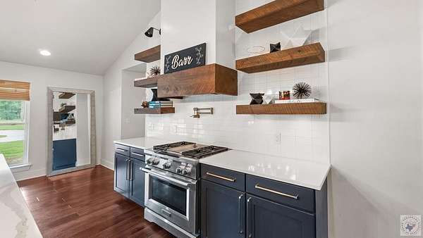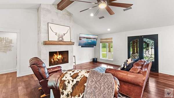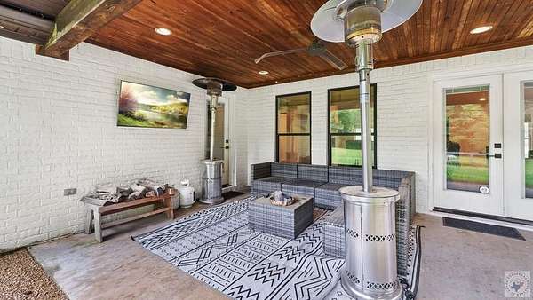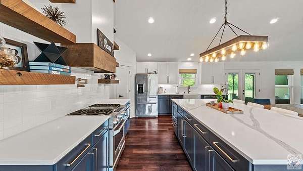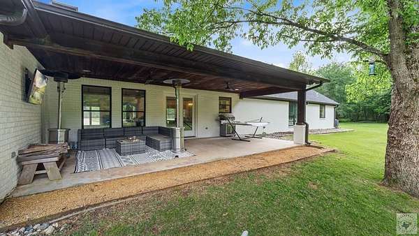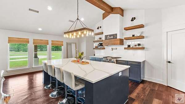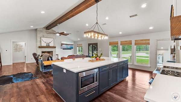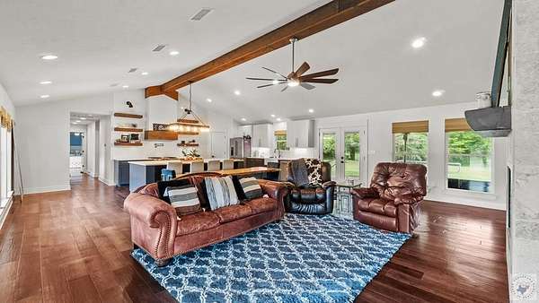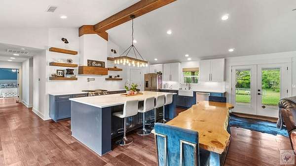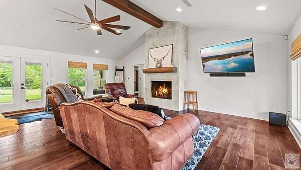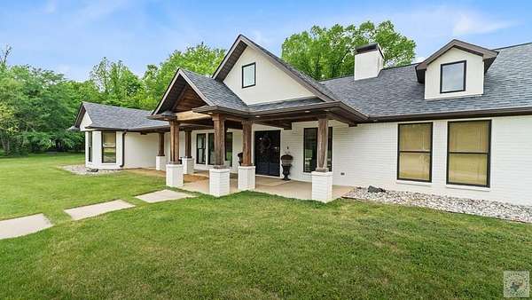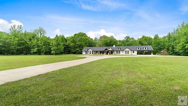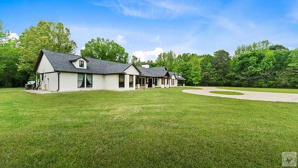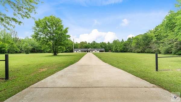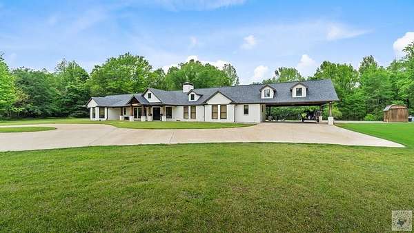 Striking in design yet grounded in its natural surroundings, this captivating modern farmhouse welcomes with circular drive, modern black-framed windows, scrolling double doors, and a privacy-lending backdrop of mature trees and sky. Inside, 3,412 square feet of thoughtfully designed interiors will inspire you to live-well as exposed beams mirror richly hued hand-scraped floors, and fashionably rustic fixtures illuminate thoughtfully selected barn doors, built-in cabinetry, and conversation-warming hearth. In the heart of your home, serve meals for occasions or help with homework from across a quartz-topped island, while elevated appliances, open shelving, and an insta-worthy range hood draw guests to entertain the chef. At day's end, six sunlit bedrooms, and four-and-a-half baths create soothing spaces to unwind, while your bespoke primary closet, bonus room, and mudroom bring elevated everyday-ease. Within Texarkana city limits, home is sited on just over 17 acres of both open greenspace and forested privacy. Explore, gather, watch wildlife, and dream of future possibilities from under the summer party-ready patio. Moments from home, routes towards commuter destinations and weekend adventures to Gateway Farmers Market, Bobby Ferguson Park, local dining, and favorite shops are just moments close.