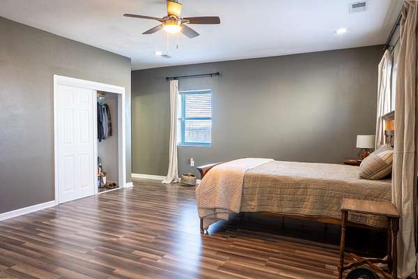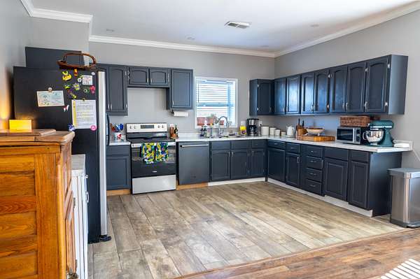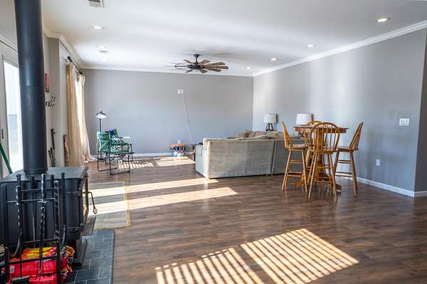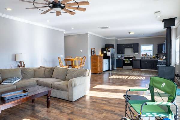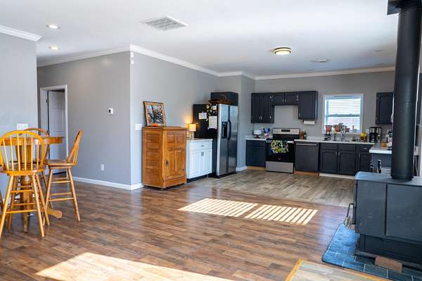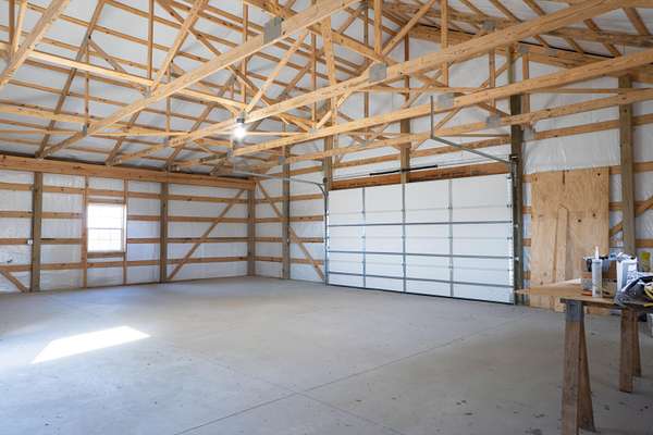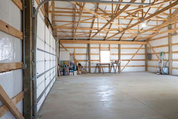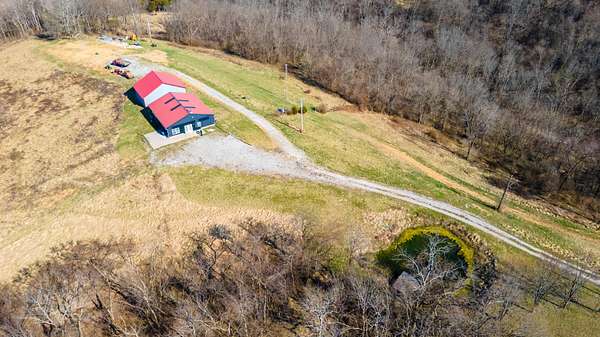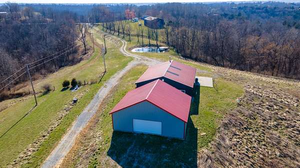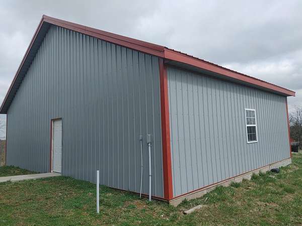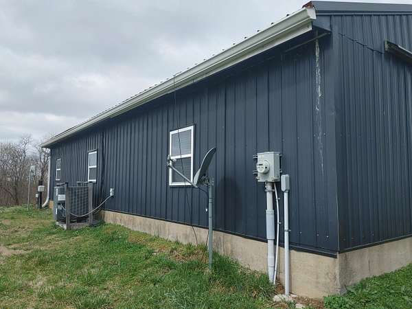 2,000 s.f. wood post and frame Barndominium refurbished in last few years with metal roofing , siding and insulation. Double hung vinyl windows, central heat and air, laminate flooring except kitchen which is tiled. At front entry you will be greeted by an expansive full width living room , eat -in kitchen and dining area .Off this is a full length WIDE hallway leading to large laundry room on L, full bathroom and two bedrooms on right. One bedroom is minus a closet. At the end of hallway on L is the expansive primary bedroom and bathroom with tiled walk-in-shower and built in shelving. All bedrooms have ceiling fans. Directly behind the barndo is a 40 x 30 insulated metal siding wood framed Amish built building with electric sitting on a poured concrete slab. Installed on backside of building is a large overhead rollup access door making for easy use of the building. This can be used as a garage , work shop, as storage or combo thereof .Some of the 19 acres offers possible use for livestock,( fencing would have to be installed) hay ,pasture, recreation, room for other building/s etc. EASY TO SHOW.