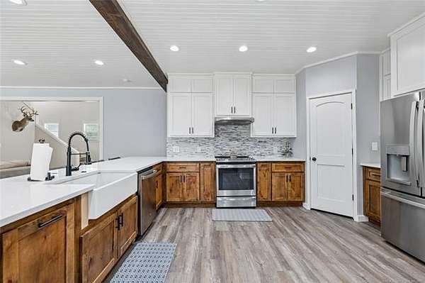 Beautiful updated 2 story home in Skiatook! Less than 10 minutes from lake, quiet neighborhood close to town. 3 bed and 2 bath. All compiled into a great floorplan! Built in 2004 with new flooring, full kitchen remodel, new GE appliances, new trim/paint, new bathroom vanity's, updated light fixtures. Detached garage with built in workshop space (20x50). Large front and back yard to enjoy! Come see!