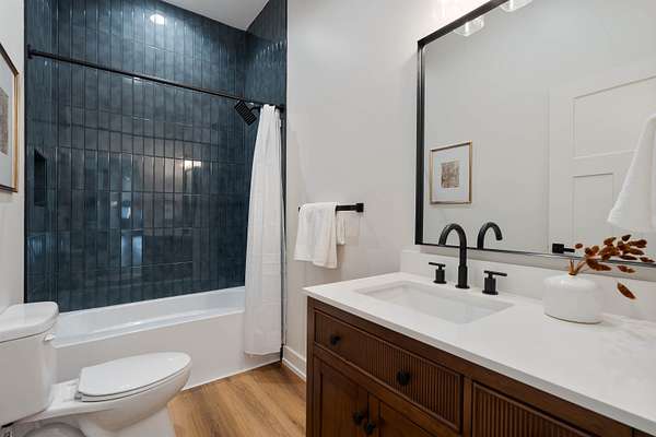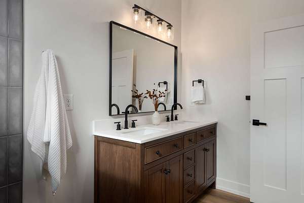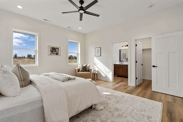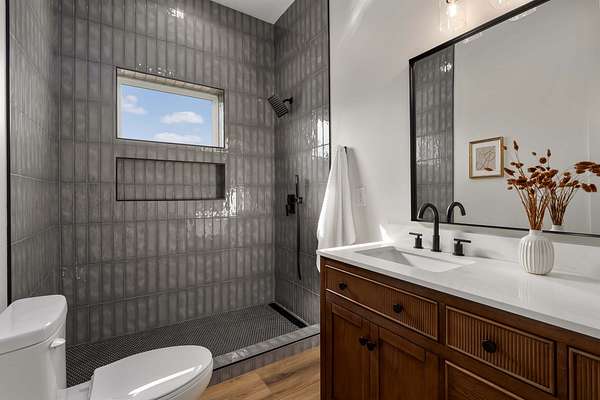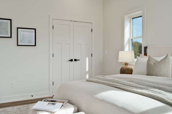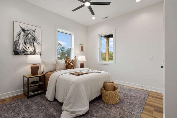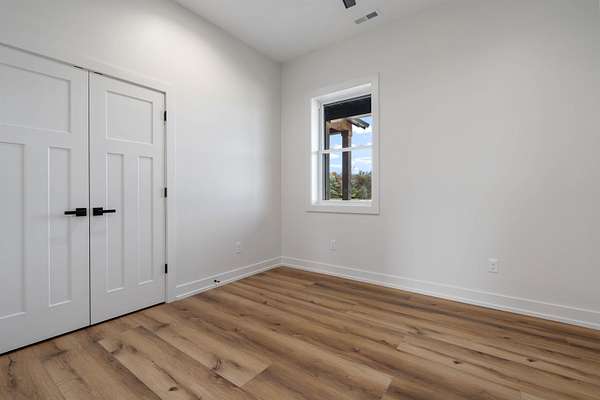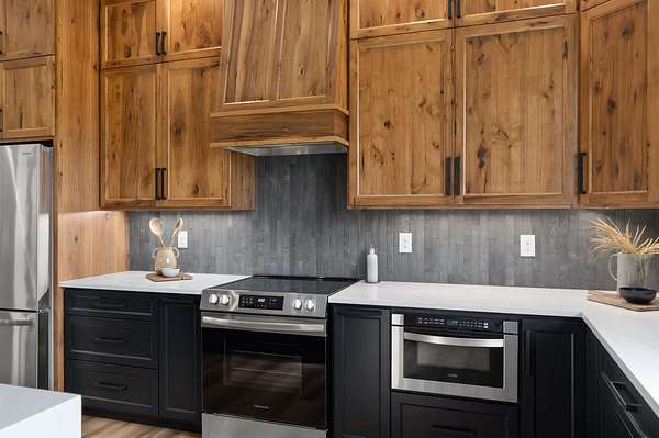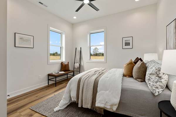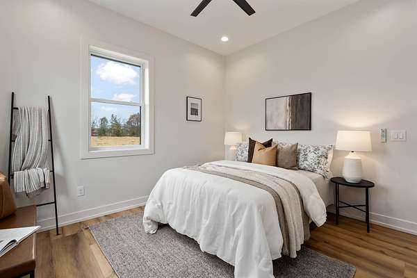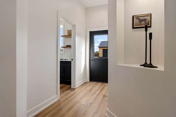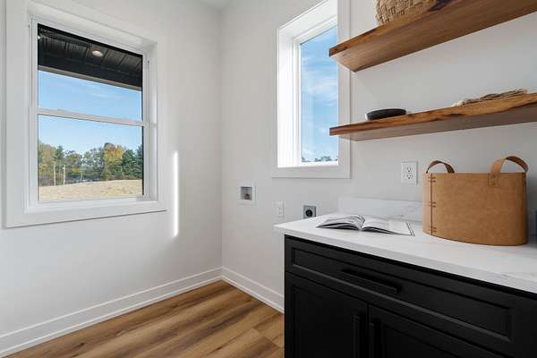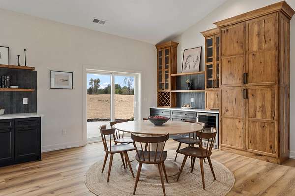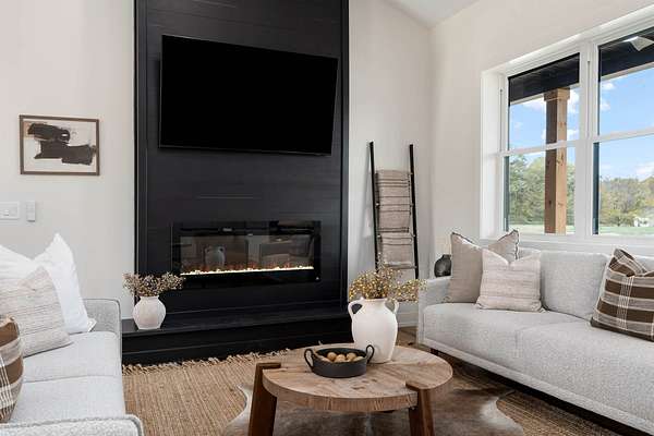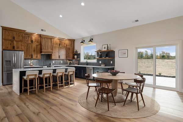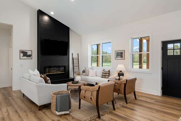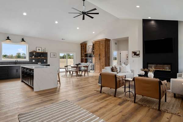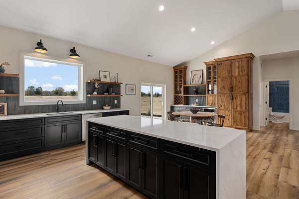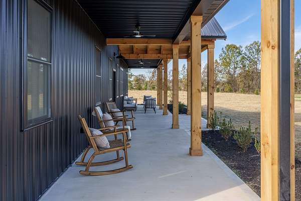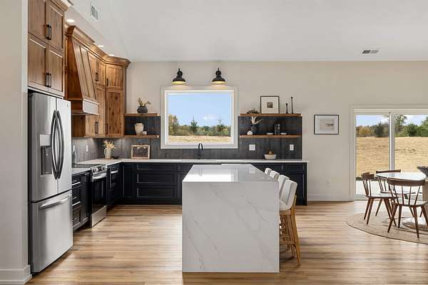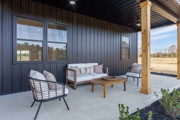 Stunning brand-new Amish-Built Barndominium on almost 4 acres, a true showcase of craftsmanship and modern design. This custom home combines timeless quality with contemporary comfort, offering over 2,000 square feet of beautifully finished living space. The striking exterior features sleek black metal siding and roof, paired with a detached, oversized two-car garage designed with extra height for larger vehicles or workshop needs. Inside, Amish handcrafted Character Hickory cabinetry anchors a gourmet kitchen accented by gleaming white quartz countertops, soft-close drawers, and premium fixtures. A floor-to-ceiling shiplap fireplace serves as the home's centerpiece, bringing rustic charm with a refined edge. The adjoining coffee bar with a built-in mini fridge and oversized pantry add both convenience and sophistication. Throughout the home, wide-plank luxury vinyl flooring enhances the spacious flow, while natural light fills every room. The layout includes four generous bedrooms, highlighted by a primary suite featuring a custom tile shower and thoughtful finishes that make every day feel like a retreat. Additional upgrades include a tankless water heater, extensive landscaping, and a private drive that ensures peace and seclusion from the moment you arrive. Blending the craftsmanship of Amish tradition with the style and functionality of today's best designs, this home is the perfect balance of rural tranquility and modern luxury.