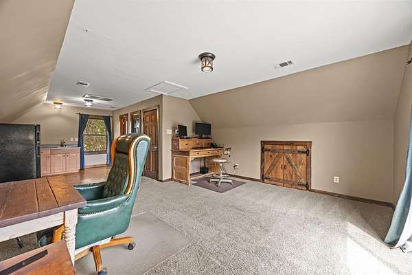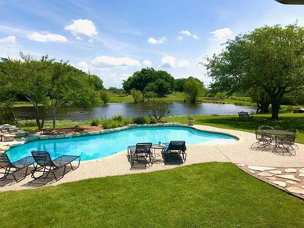 Enjoy outdoor living w-1,350 sf wrap-around porch—part of it screened-in—& sparkling, resurfaced pool w-waterfall. Property has mature trees & a picturesque 1.5 +-acre, stocked fishing pond. Detached 2-car garage includes an apartment above—perfect for guests, rental income, Airbnb-VRBO space, extended family-MIL suite, home office, or media room. Apartment features full bath, kitchenette w-sink & refrigerator & stove hookups, as well as a tankless water heater for efficiency & comfort. Metal building is ideal for a workshop, she-shed, or extra storage.