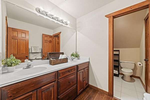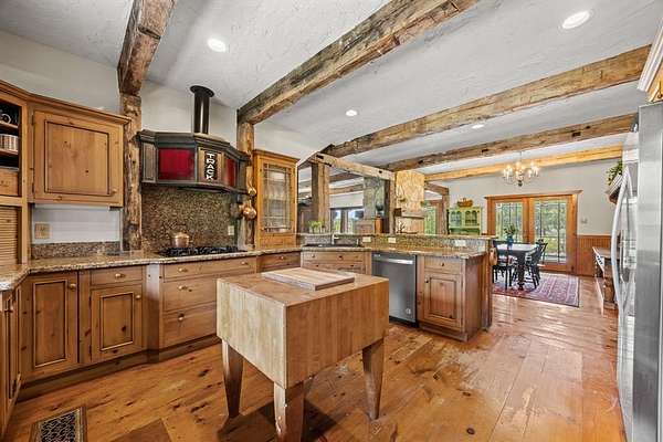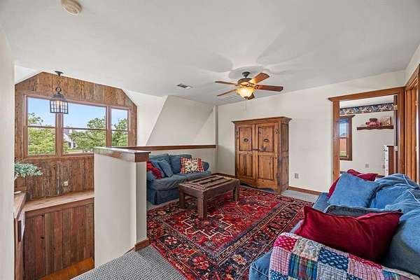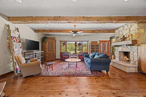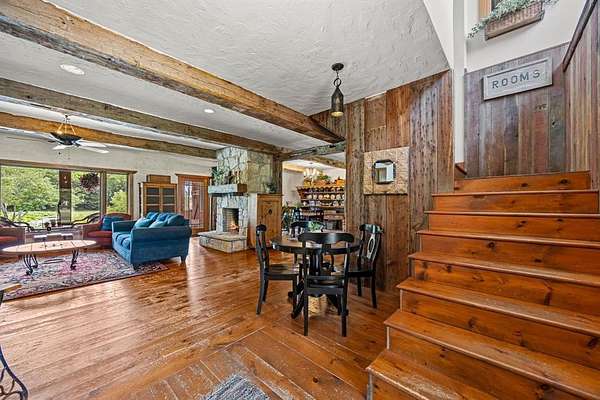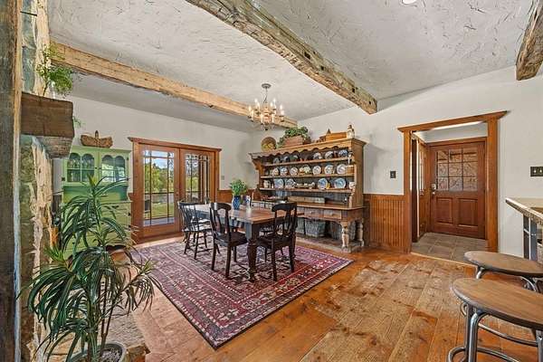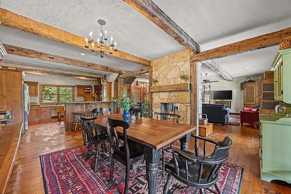 Welcome to your dream country escape with no HOA & over 4,077 sf air-conditioned space which includes the 418 sf garage-apartment! Nestled on 5.6+ scenic acres in desirable Rockwall County, this 3,659 sf rustic, farm style home blends timeless charm w-functionality. You’ll find perfectly-weathered, recently re-stained soft pine floors, massive solid oak beamed ceilings & a see-thru fireplace that adds warmth & character to the newly-painted kitchen, dining room, living room. Kitchen features gas cooktop, vintage decorative vent hood, ample cabinetry, counter space & walk-in pantry. Main level includes spacious primary BR with ensuite bathroom with jetted tub, extra bedroom currently dedicated home office space, utility room & 2nd full bath. Upstairs are 3 add’l bedrooms w-walk-in closets, Jack & Jill bath & versatile common area—ideal for a 2nd living area, game room, or study space.
